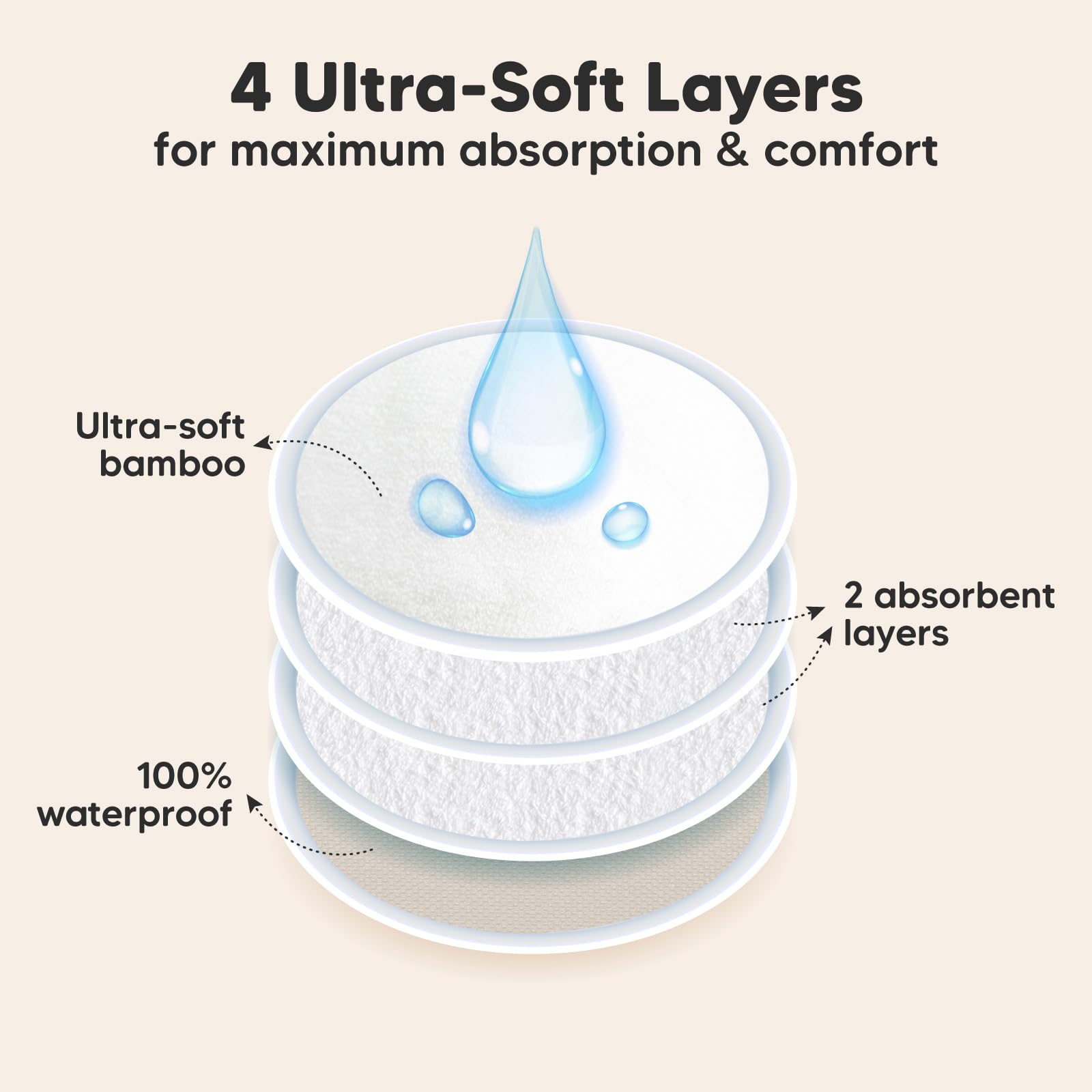 Great For Leakages – Leakage is a thing of the past with our 4-layer nursing pads. KeaBabies Nursing Pads feature three layers of ultra-absorbent viscose derived from bamboo, sealed with a protective waterproof outer layer for extra security on the nipple pads. Tip: If you experience a heavy flow, please replace breast pads every 5-6 hours.