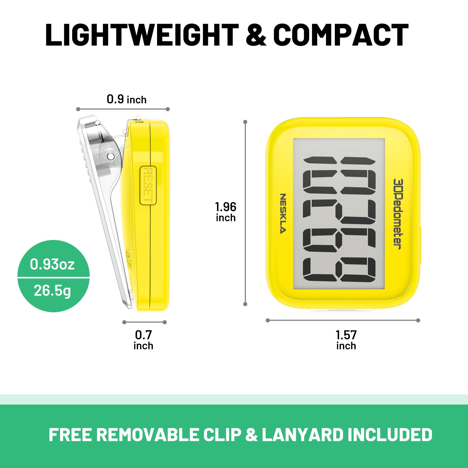 EASY TO CARRY: Pedometer is only 26.5g. It is easy to put it in pocket or bag. It contains a removable clip and a lanyard. Can be clip on the belt, pants, shoes. Hanging on neck