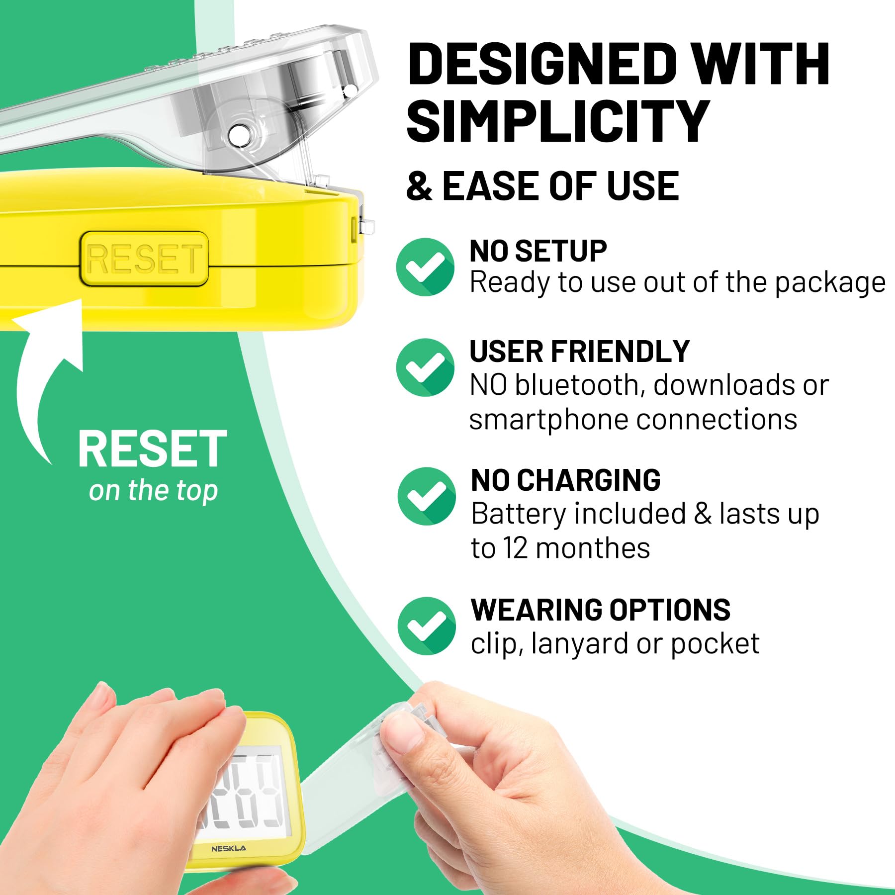SIMPLE & EASY TO USE: 3D Pedometer for Steps Only. No Bluetooth, no app or smartphone connections required. Only one reset button, To reset the counter, just only need to press and hold the RESET button for 3-5 seconds to get the step to "0"