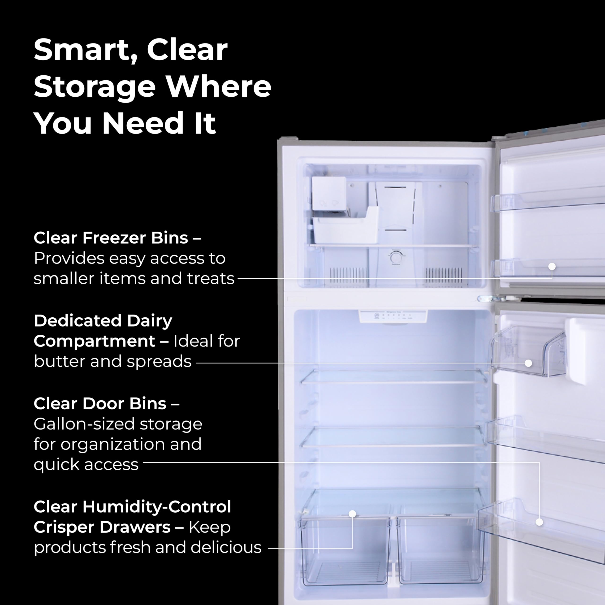 Gallon Door Storage + Freezer Bins: 3 clear refrigerator door bins hold gallon jugs, condiments, and more. 2 full-width freezer door bins keep smaller frozen items organized and easy to reach