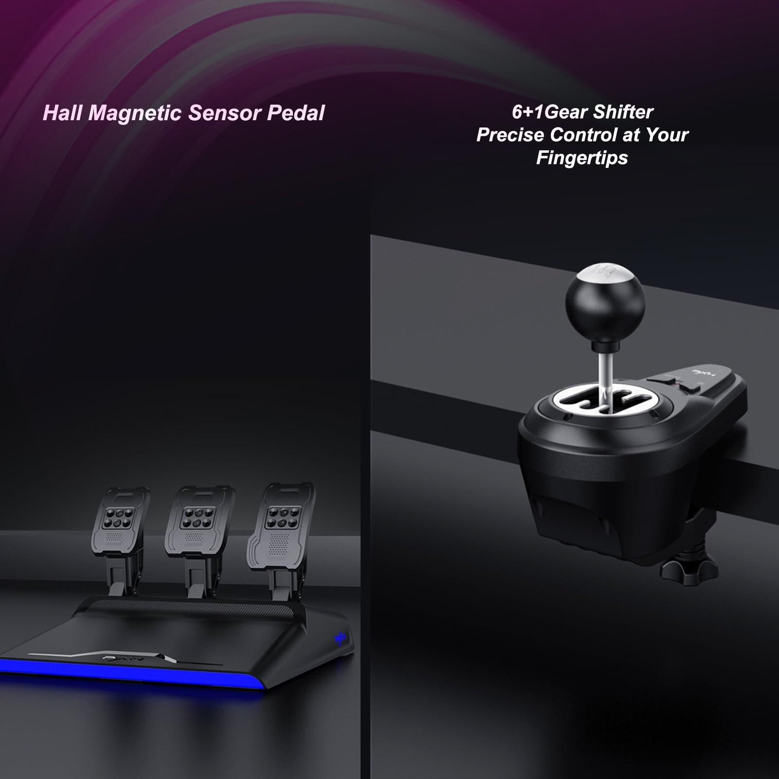 【Large Size High-end Racing Wheel】11.8 inch(300mm)diameter big and Detachable steering wheel with dual paddles to release your driving excitement,finger slide to complete the gearshift action.3IN1 pedals(clutch/brake/accelerator)with Hall magnetic induction technology to achieve high precision and good linearity give you a more sensitive and accurate braking experience.The pedals' angle is adjustable according to your preference. 6+1 shifter with push down reverse gear brings fast and smooth shifting.
