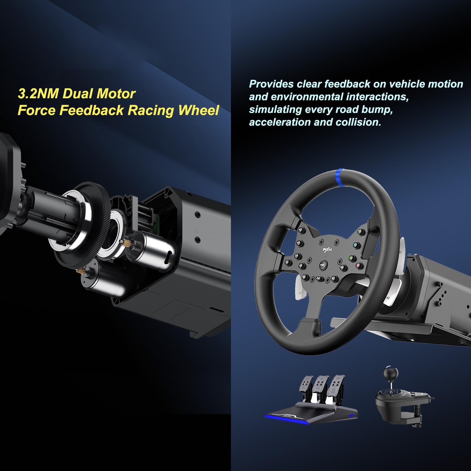 【With 3.2Nm Force Feedback】270°/900° 3.2Nm force feedback game steering wheel with dual motor brings you the real racing experience.The force feedback transmitted to the hand very real and quickly.The steering wheel quickly returns to the center,allowing you to react accurately.Recommended games: For PC supports Euro Truck Simulator 2,F1 2022,F1 2023,Forza Hoprizon 5,iRacing,Assetto Corsa,WRC 10,Farming Simulator 22,Dirt Rally 2.0,etc.; For Xbox host supports Forza Horizon 5,Dirt Rally 2.0,Assetto Corsa,WRC 9,Snow Runner,etc.; For PS4 supports Need for Speed 20,GT7,Project CARS 2,F1 2020,DIRT 5,NASCAR Heat 5,etc.