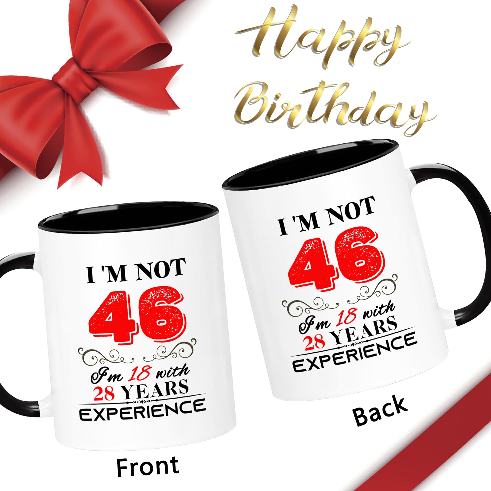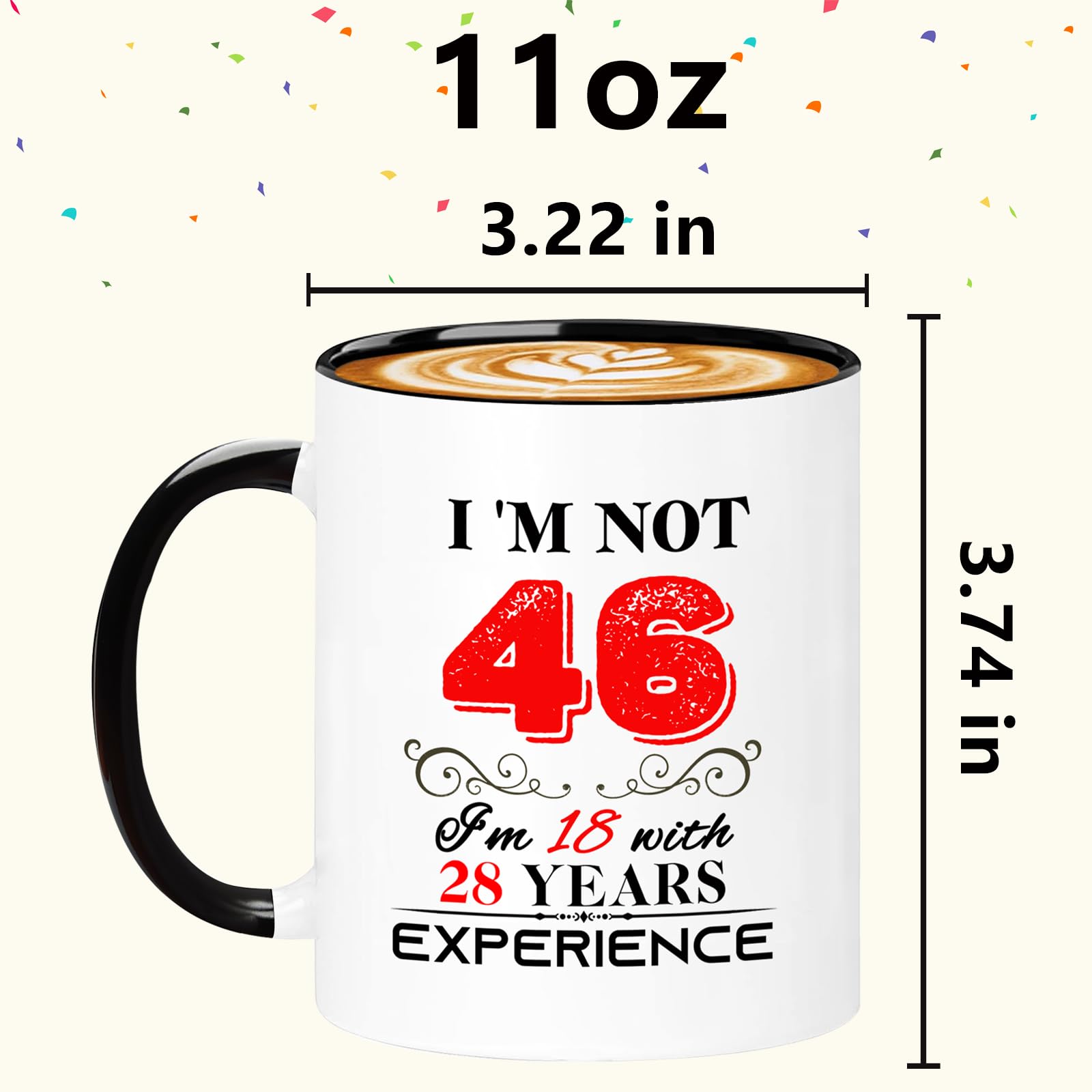 【Birthday Gift】: This funny "I'm not 46, I'm 18 with 28 years experience" Mug is the perfect birthday gift for a 46 year women men! Give it to your mom, dad, papa, mama, brother, sister, husband, wife, aunt, uncle, cousin, son, daughter, boyfriend, girlfriend, boss, coworkers, bestie, granddaughter, or your best friend for her he birthday.