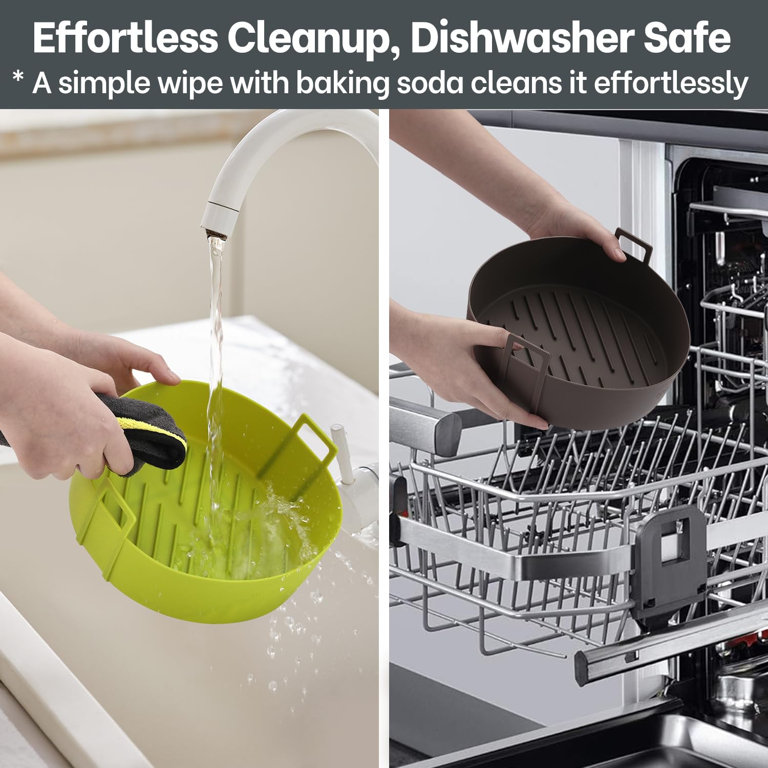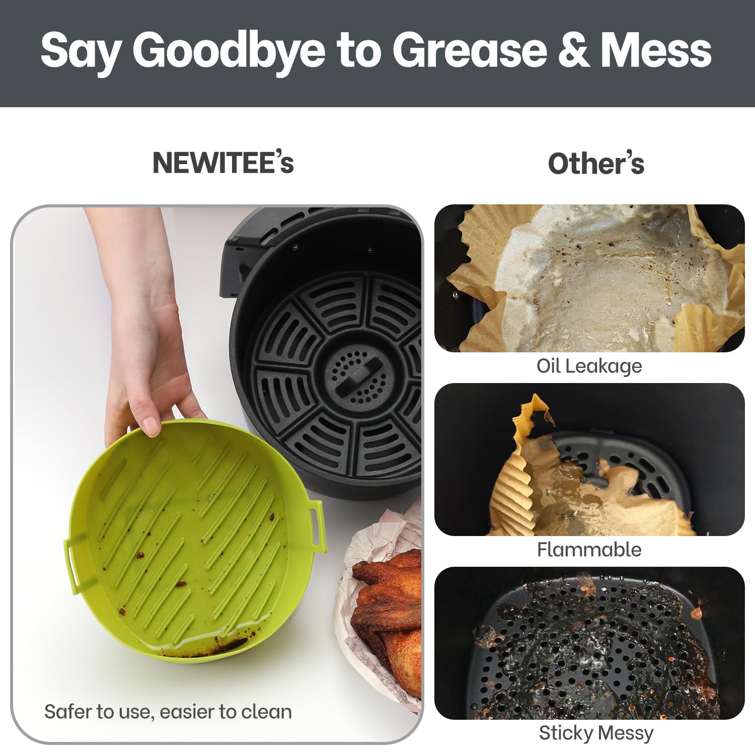 EASY TO CLEAN: Tired of paper liners leaking oil? Let's replace them with NEWITTE air fryer liners silicone. They are soft and flexible, hand washable in warm water, and dishwasher safe. No sticky residue or oil leaks—say goodbye to greasy, dry stains and countless hours of scrubbing your air fryer. They keep your air fryer basket clean and provide long-lasting durability