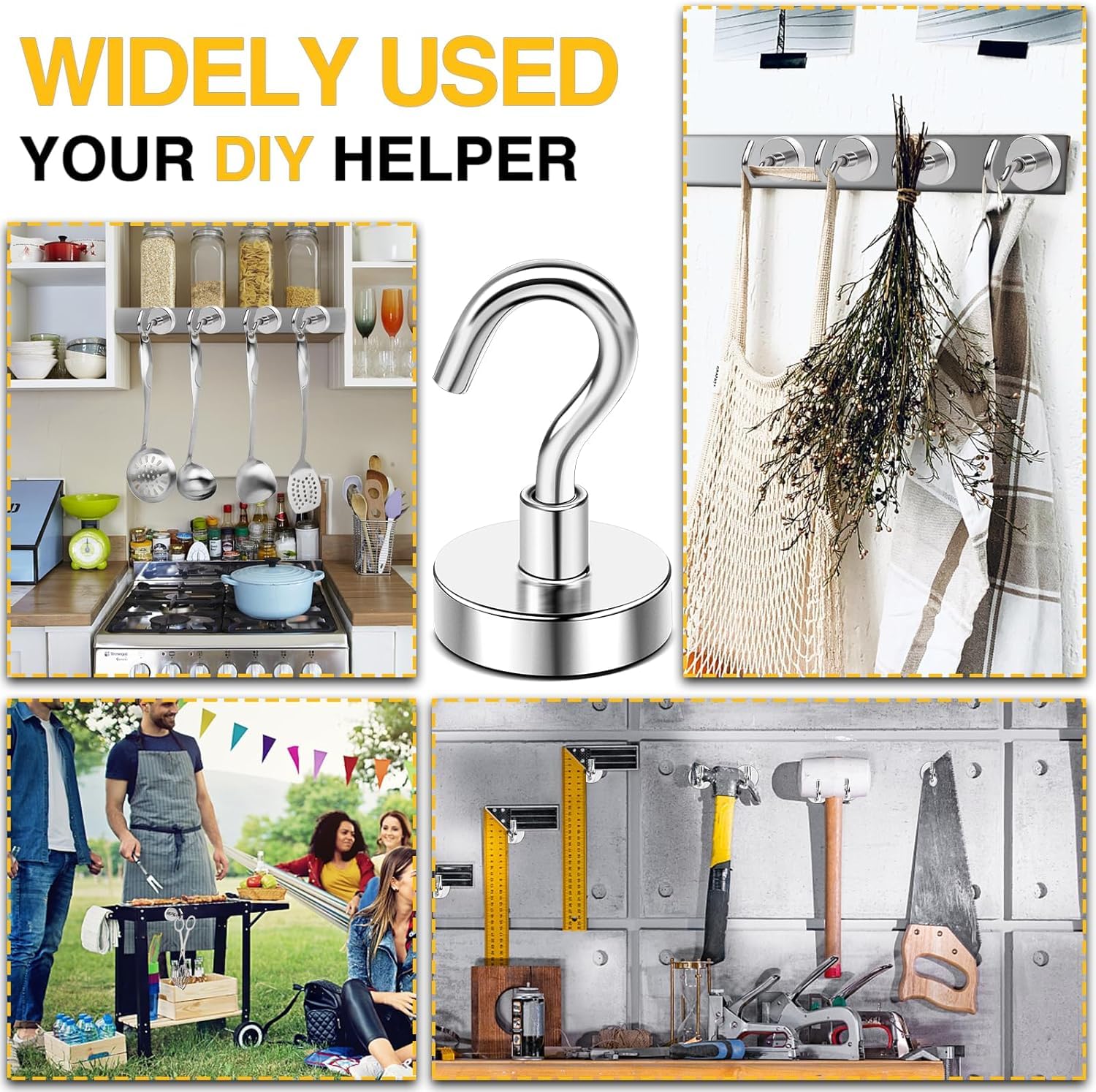 【Versatile Use】Rare earth neodymium magnet hooks are ideal for hanging various household articles, office material etc., great for organization. They are also widely used in cruise, fridge, kitchen, locker, workplace office, garage, indoor, outdoor and anywhere there is iron or steel. No drilling holes, No sticky residue, No bolt or screws; Easy to install or remove and reusable