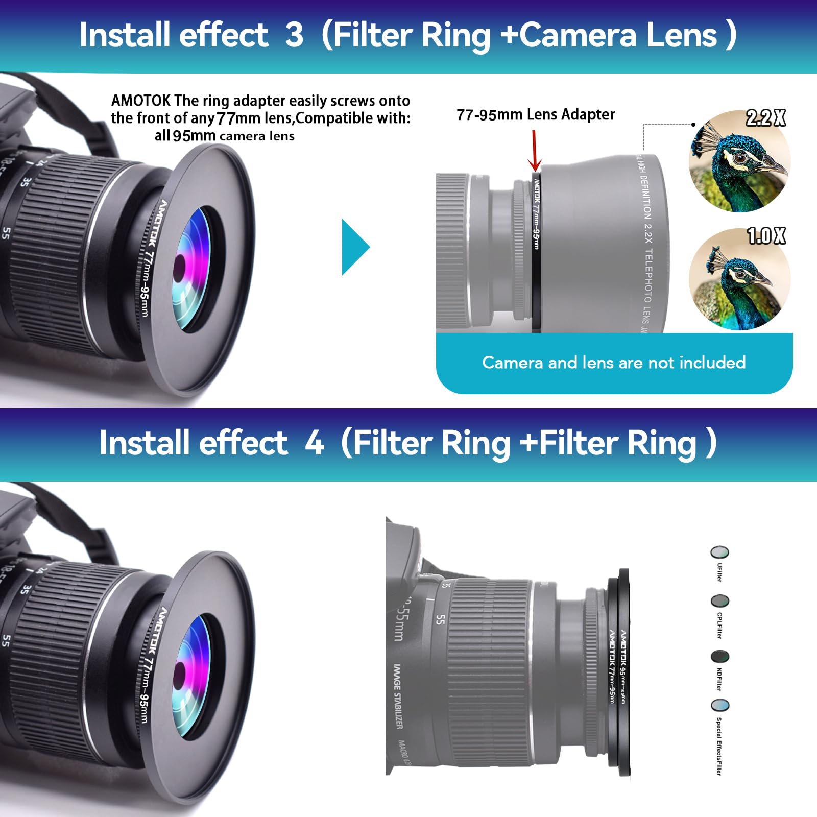 【2】AMOTOK The ring adapter easily screws onto the front of any 77mm lens,and converts the thread size of your lens to the thread size of any other 95mm accessory(such as filters,hoods,flashes and lens converters),and other 95mm accessories.