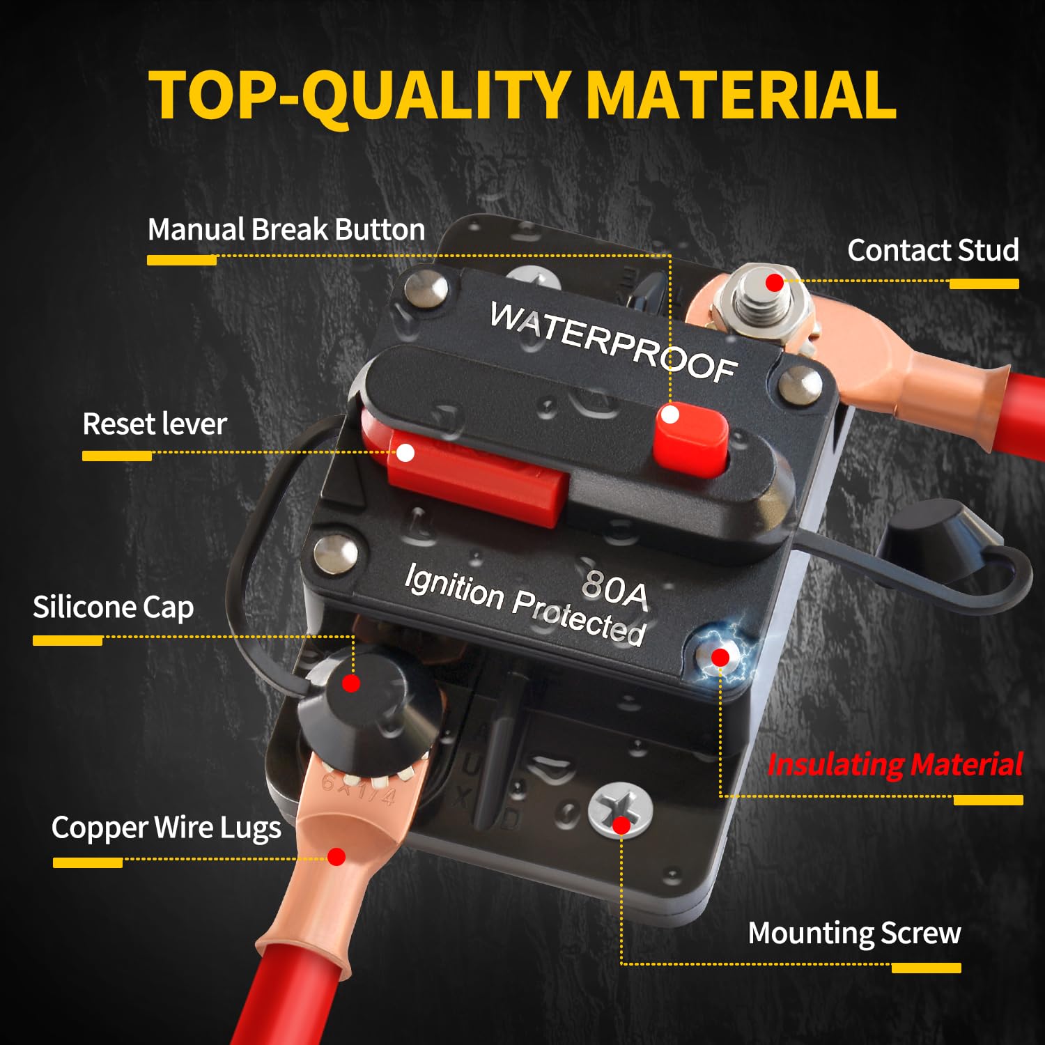 【Specification】: 80 Amp Circuit Breaker 12v, Operating Voltage: DC 12V - 48V, Waterproof IP 67, Meet S.A.E. J1625, J1171, UL1500 (Ignition Protected). Widely used in marine and automotive circuits, suitable for Boat, Yacht, Kayak, RV, Trailer, Bus, Truck, Winches, ATV, solar system etc.