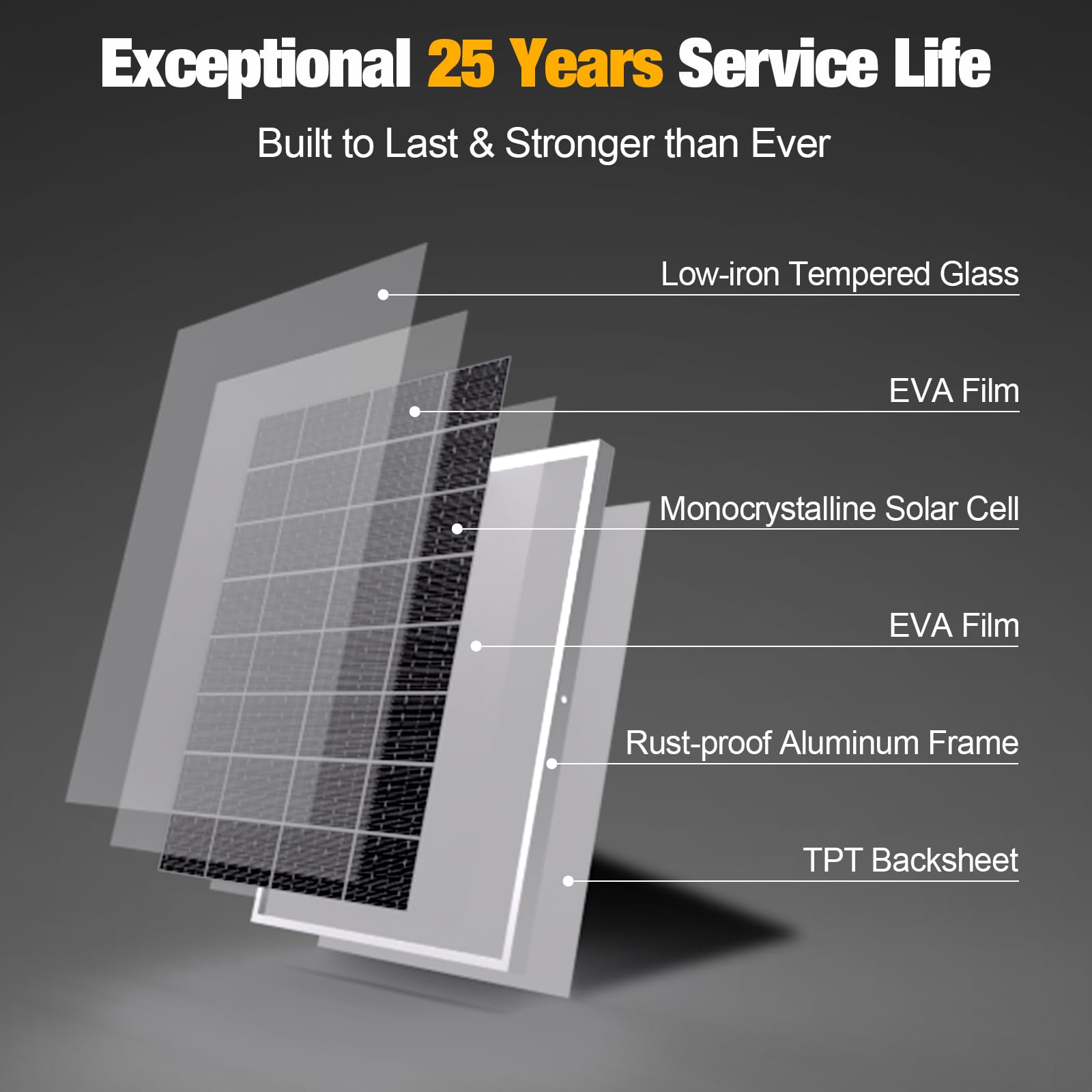 【Durable Design】Featuring a low-iron tempered glass surface and a corrosion-resistant aluminum frame, this solar panel is completely waterproof and rustproof, offering an impressive lifespan of up to 25 years. This 12V solar panel is engineered to endure harsh weather conditions, including sandstorms, high winds, thunderstorms, blizzards, and hail. It can handle wind pressures up to 2400Pa and snow loads of up to 5400Pa.