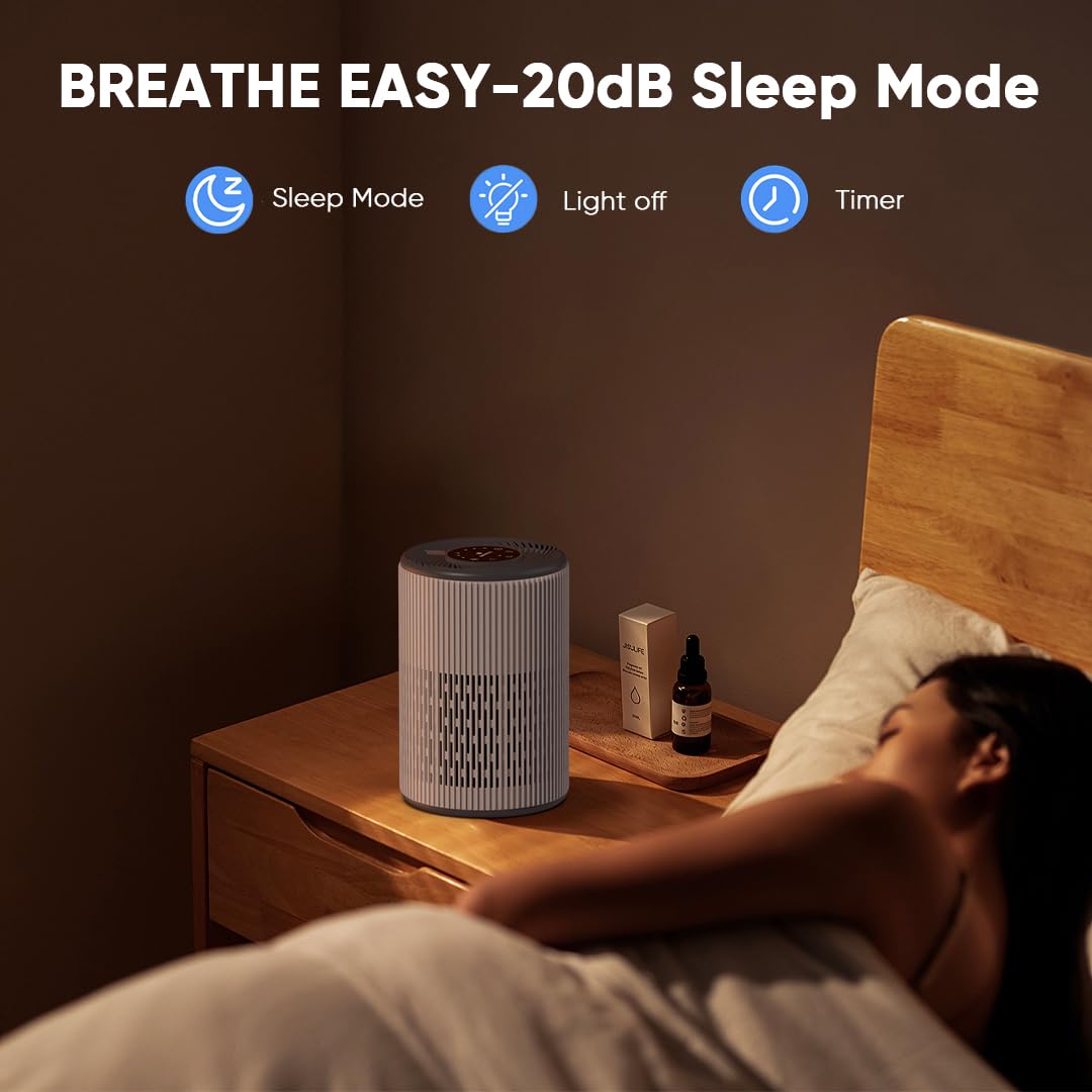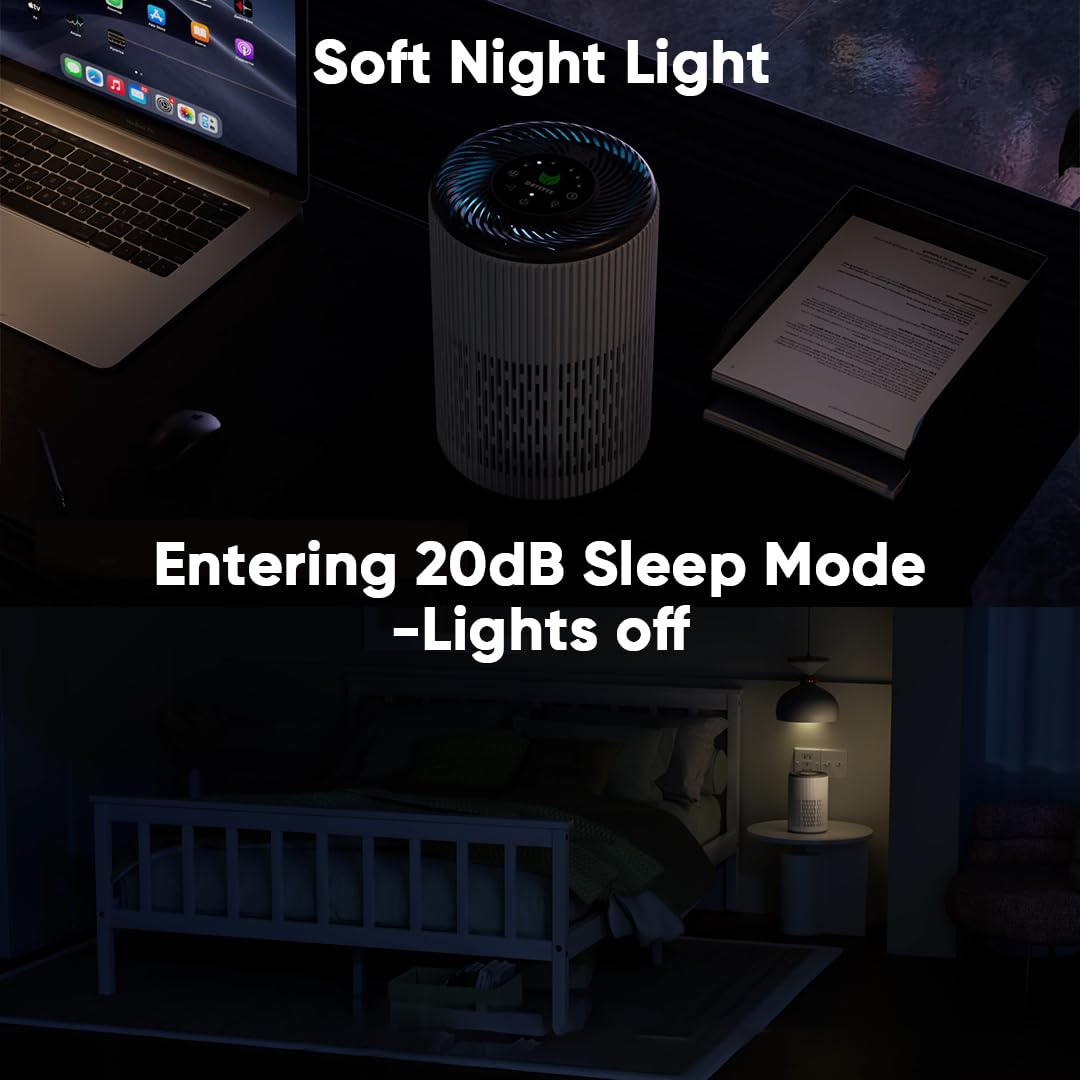 【Sleep-Friendly Night Light & Quiet Mode】 DAYETTE air purifier for bedroom features a soft blue night light to gently illuminate your space, ideal for those needing minimal lighting to sleep. It offers gentle guidance at night without harsh brightness. In sleep mode, the night light automatically turns off, and the small air purifier operates at a whisper-quiet 20dB, ensuring a peaceful, undisturbed night’s rest