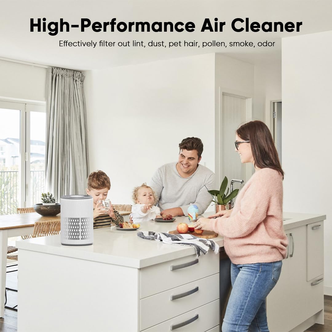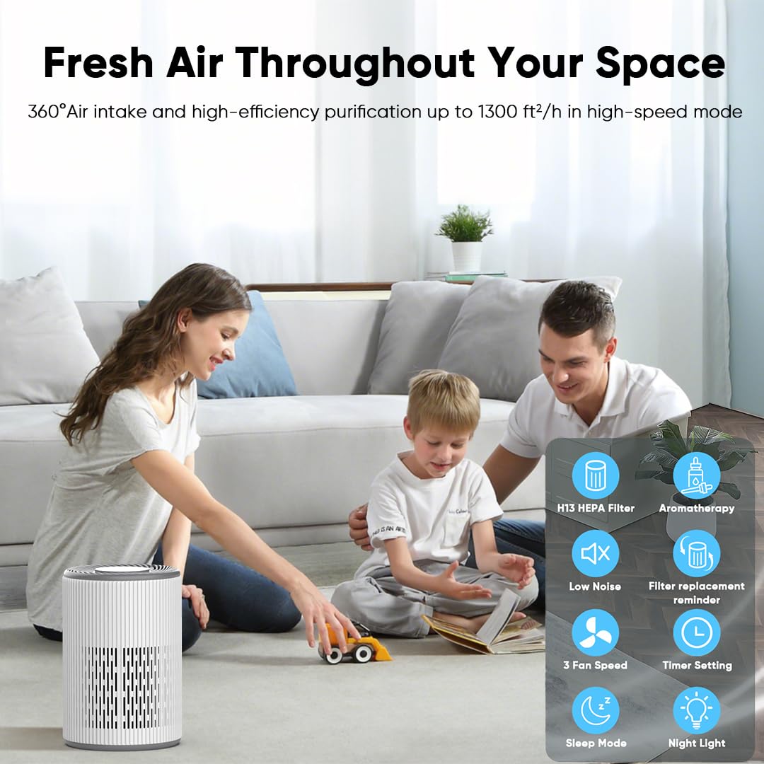 【High-Efficiency Purification up to 1300 ft²】 Tailored for large rooms but versatile enough for any space, this compact and portable air purifier features 360°air intake for thorough cleaning. With a high-efficiency filtration system, it covers up to 1300 ft² per hour in high-speed mode and delivers 6 air changes per hour in a 216 sq ft area.Its modern design fits seamlessly into bedrooms, living rooms, offices, nurseries, kitchens, and basements