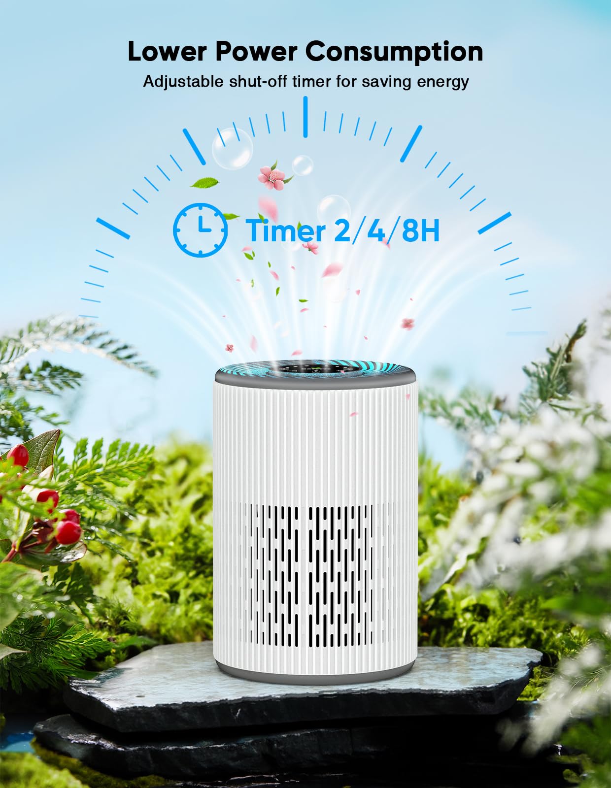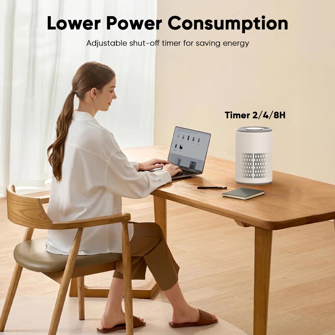 【Customizable Settings for Your Needs】This small air purifier offers three fan speeds—Sleep, Low, and High—choose the perfect setting based on your preferences. Choose from three timer settings: 2, 4, or 8 hours. Set it to 8 hours for automatic shutdown upon waking, ensuring quiet, efficient operation. When the filter needs changing, all lights flash. Replace with an official filter and press and hold the HEPA button to reset. Using authentic filters guarantees peak performance and longevity