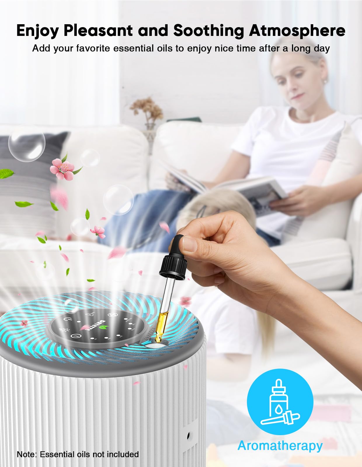 【Relaxing & Pleasant Aromatherapy Experience】 Transform your space with our air purifier for home(Model: AP201), featuring a built-in aromatherapy diffuser. Add your favorite essential oil, switch to high speed, and enjoy a room filled with soothing fragrance in just 10 minutes. It’s purification and relaxation combined—clean air meets calming scents, perfect for unwinding after a long day. Refresh your home effortlessly