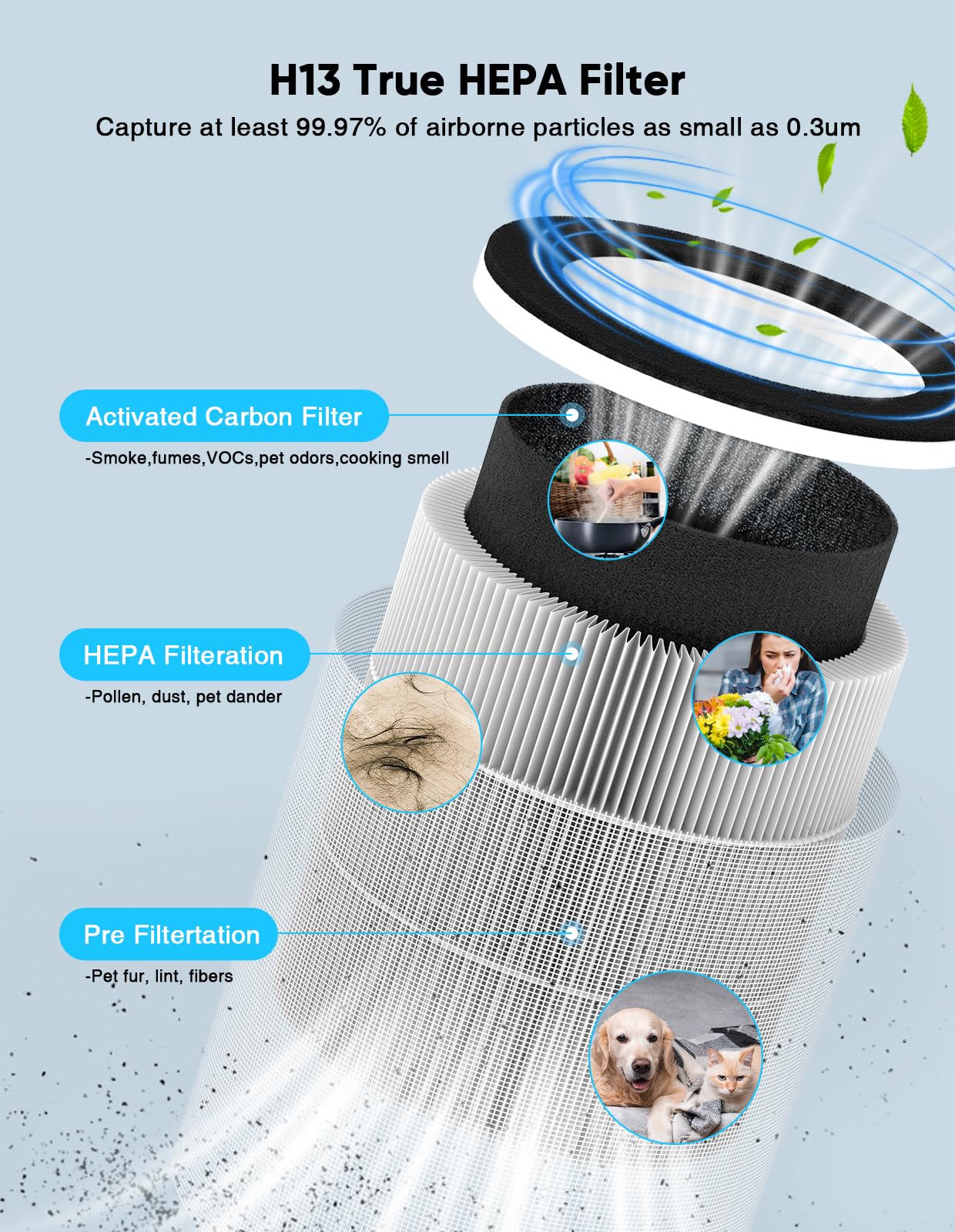 【H13 True HEPA Filter】Our Hepa Air Purifiers feature H13 HEPA filter, equipped with a 3-Stage Filtration system, works alongside the Pre-Filter and High-Efficiency Activated Carbon Filter to capture 99.97% of airborne particles 0.3 microns in size, physically absorbs dust, smoke, pollen, odor, pet dander, especially effective for cooking smells or multi-pet household. Perfect for pet owners, babies, children, the elderly, or anyone wanting to improve the air quality