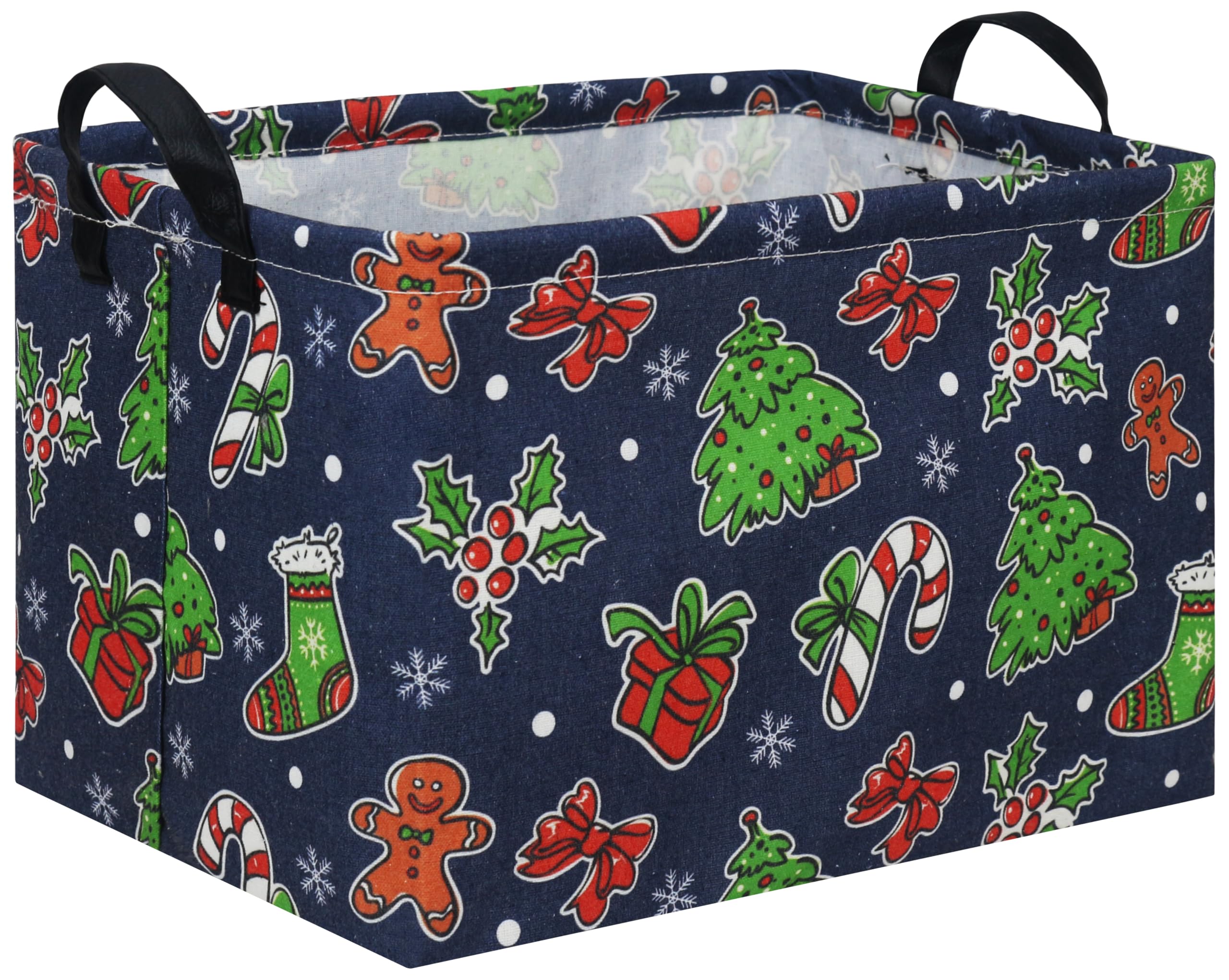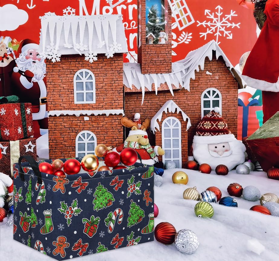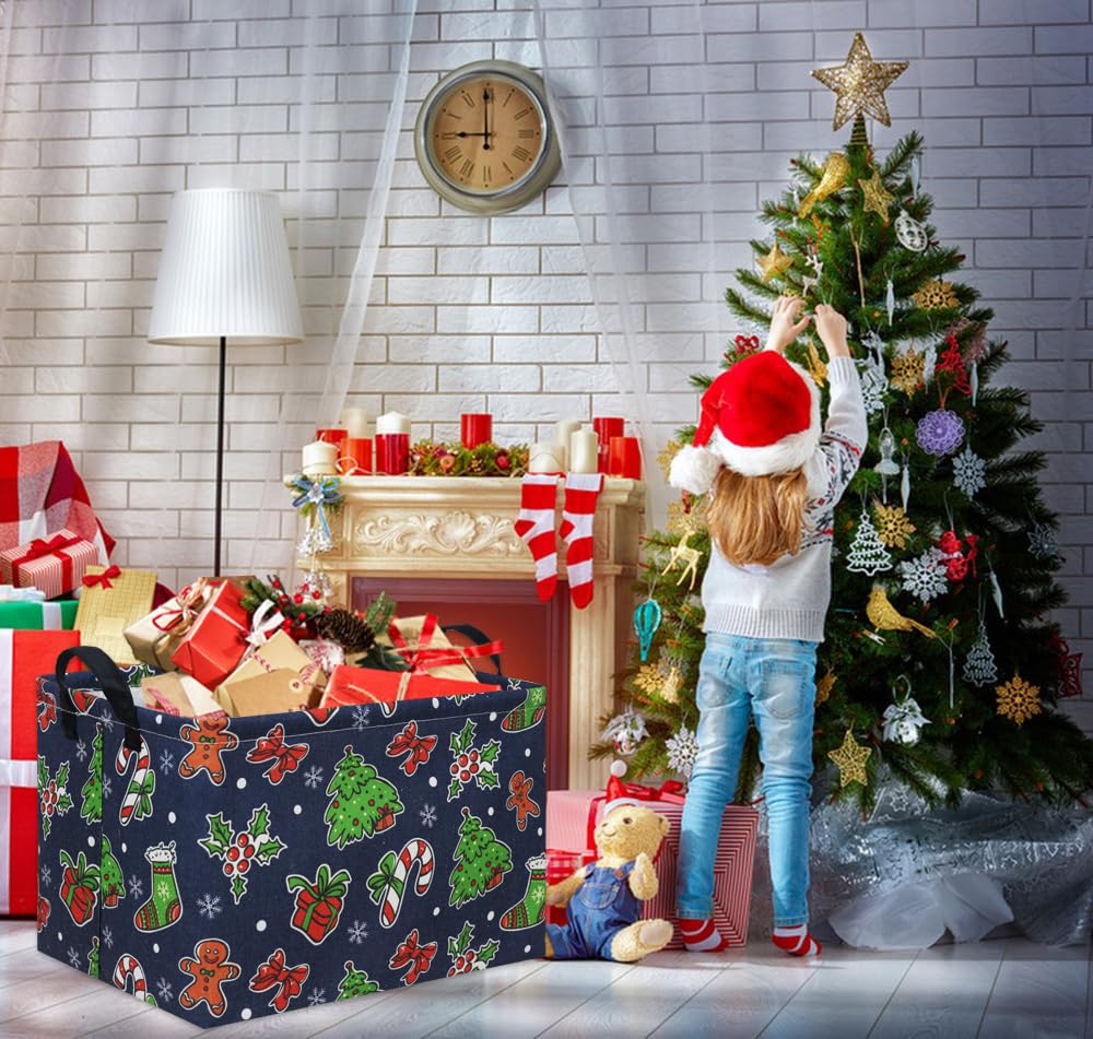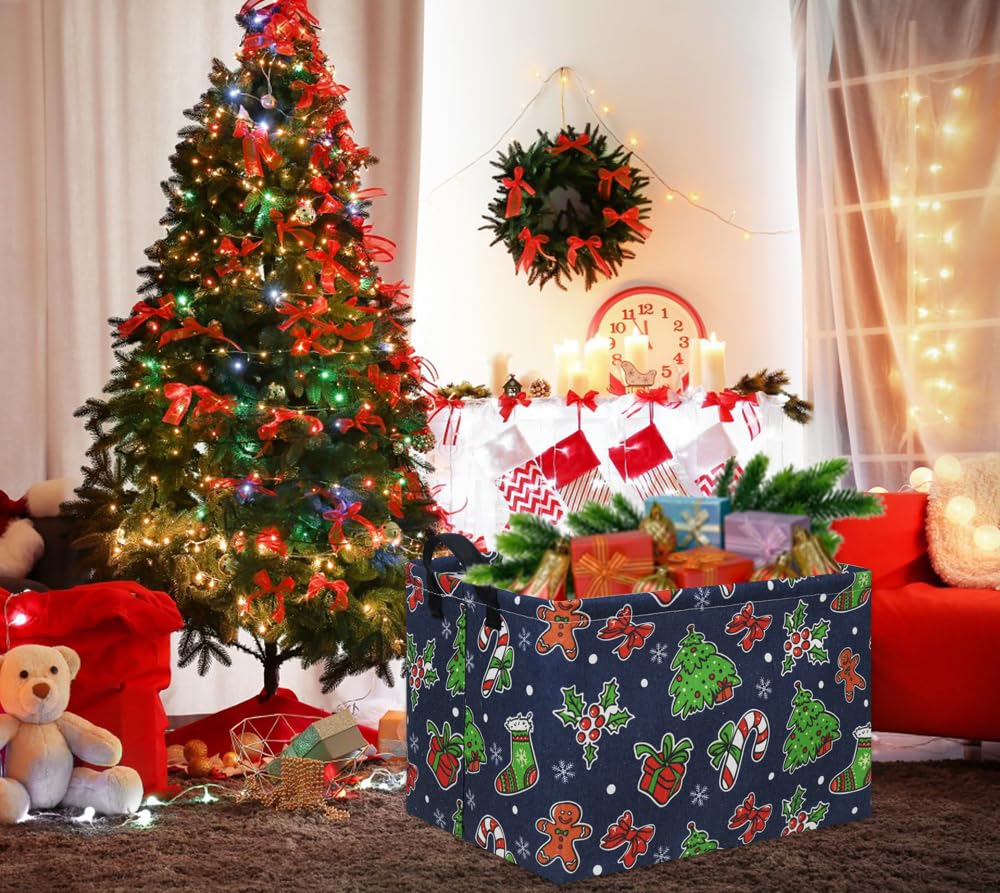 MATERIAL:The christmas basket is made of durable canvas &The inner lining is made of waterproof fabric; sturdy metal rod frame around the top keep the basket shape.