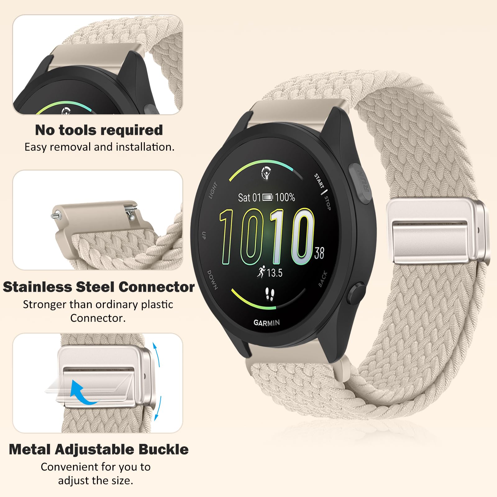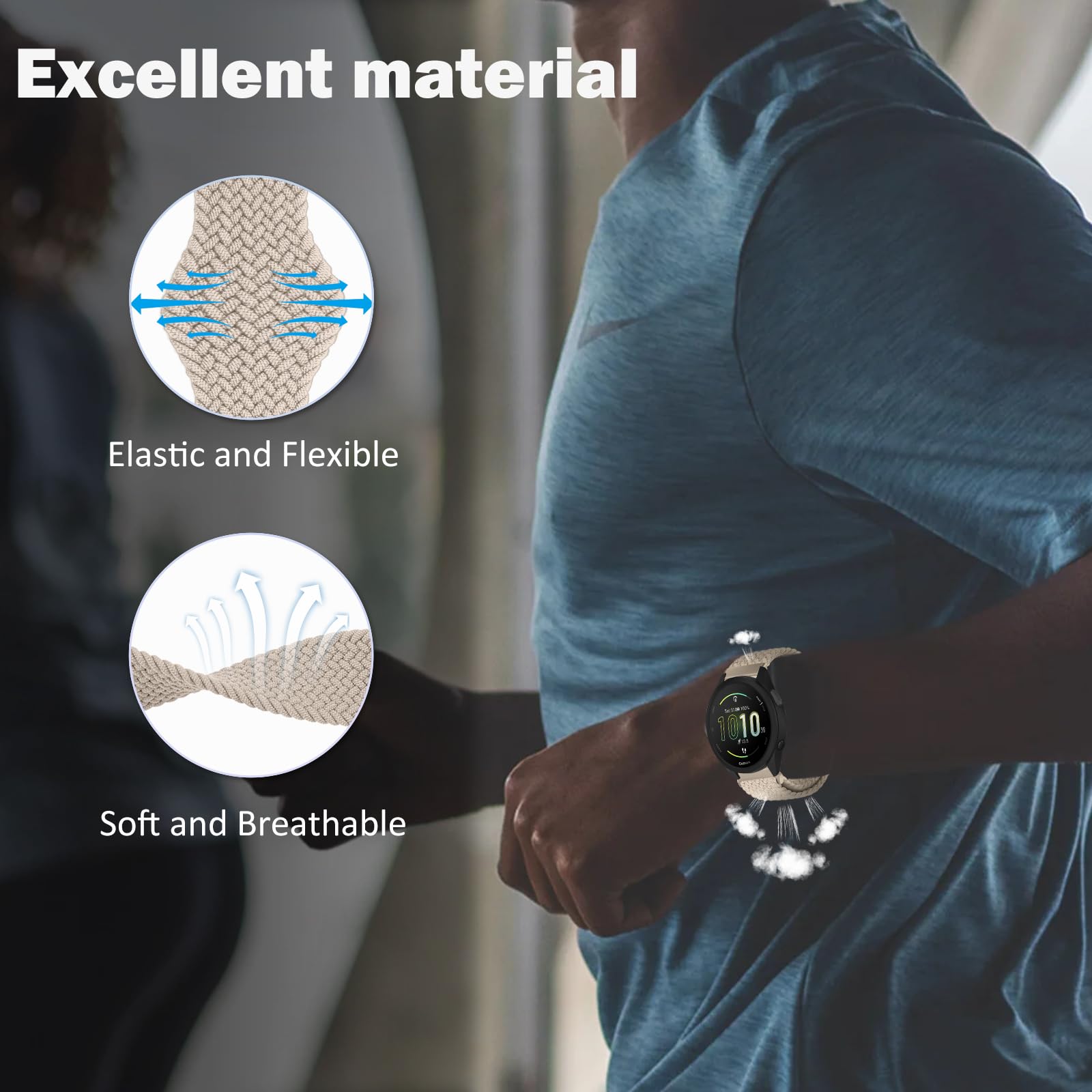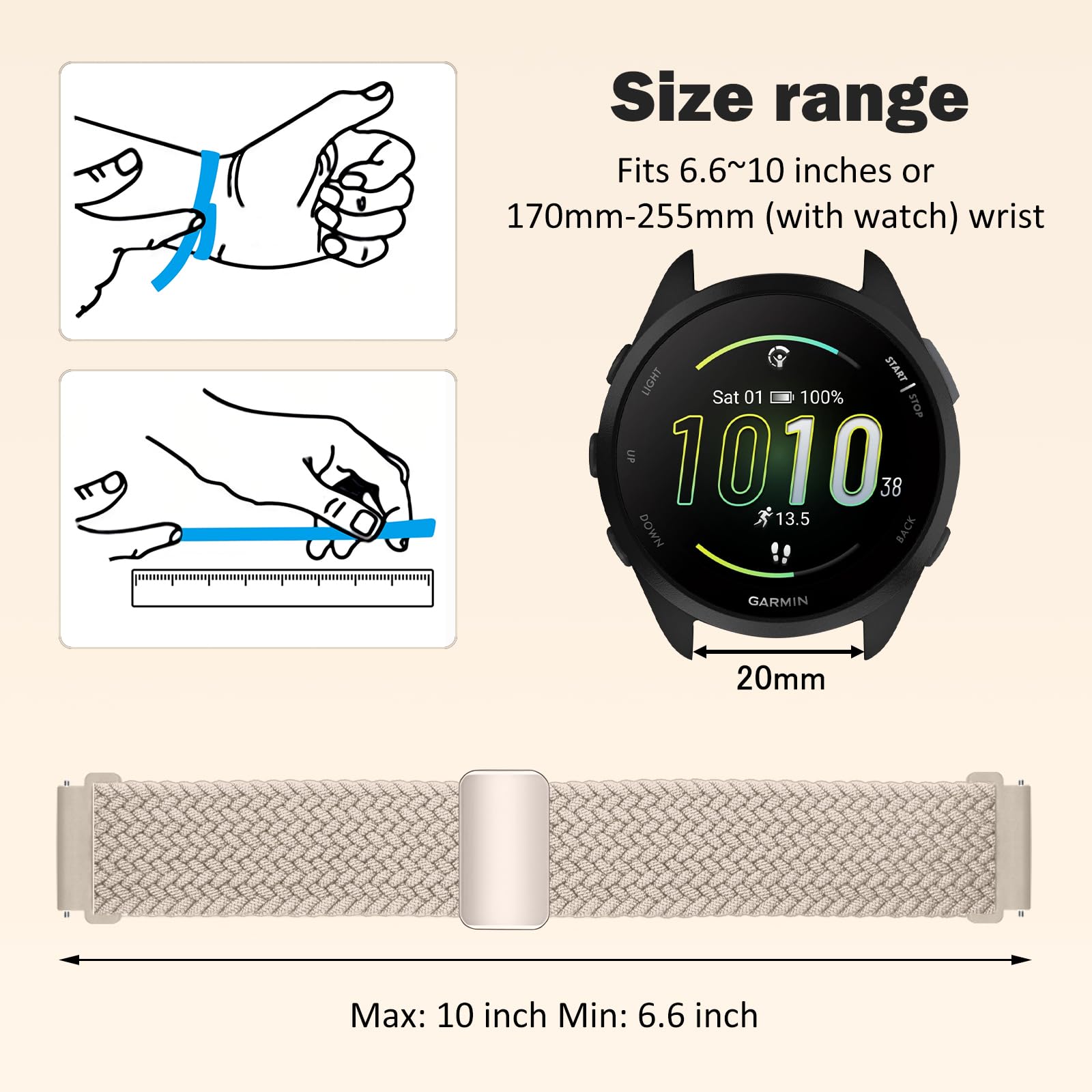 【Compatible Models】This band is compatible with Garmin Forerunner 570 42mm/Forerunner 165/Forerunner 165 Music/Vivoactive 6/Vivoactive 5/vívomove Trend/Venu Sq 2/Venu Sq 2 Music Edition/Venu 2 Plus /vivomove Sport /vivoactive 3/vivoactive 3 music/Approach S50/Approach S44/Approach S42/vivomove 3/Garminmove 3/Forerunner 245/Forerunner 645/VivoMove/Garminmove/Compatible with Amazfit T-Rex 3 Pro 44mm/Active 2/Active/GTR Mini/GTS 4/Bip 3.(Or Fits any watch with a 20mm strap.)