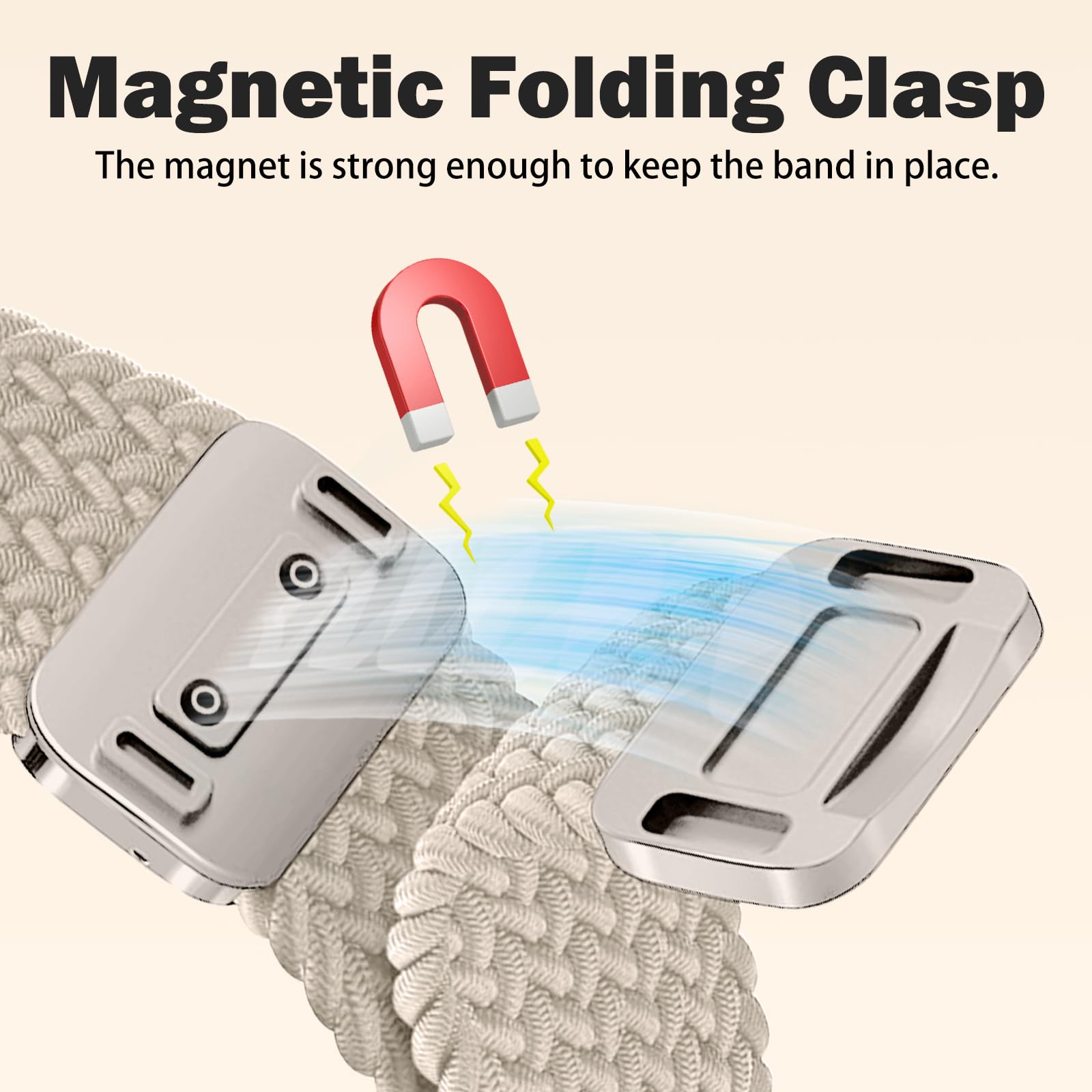 【Magnetic Clasp】This strap is equipped with a magnetic metal Clasp, which is more stable and durable, and very convenient for you to put on or take off your smart watch. The magnetic Clasp is movable. You can easily adjust the size to fit your wrist. Don't worry if you accidentally drop the watch when exercising, the magnet is strong enough to keep the band in place.