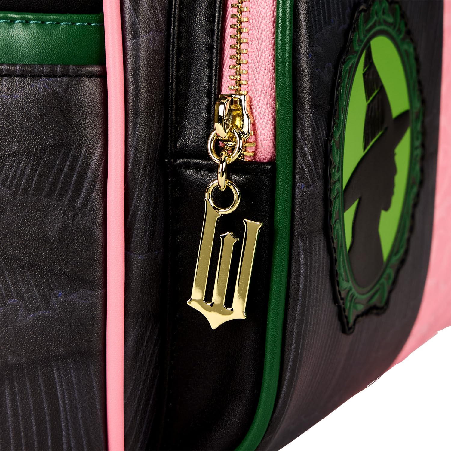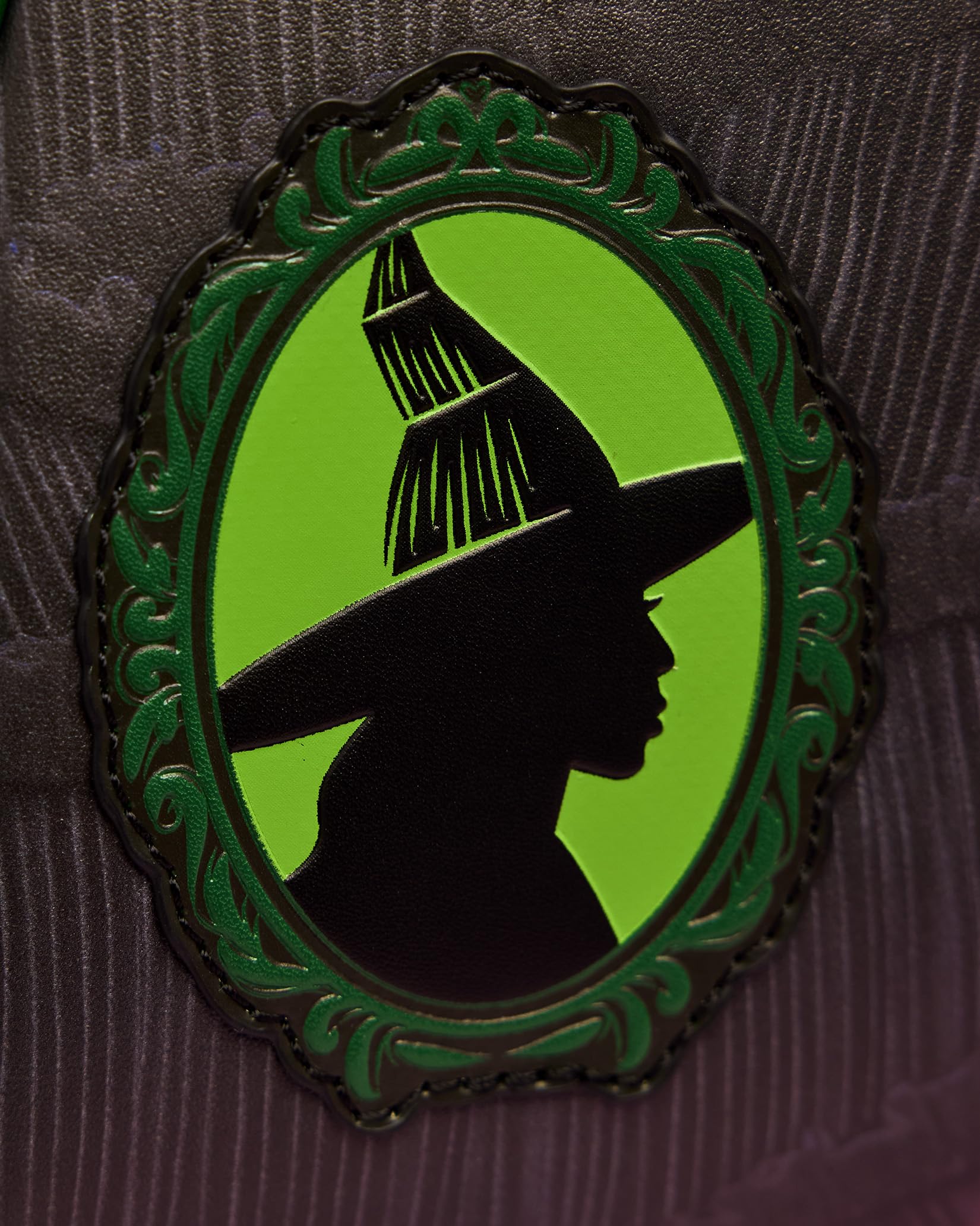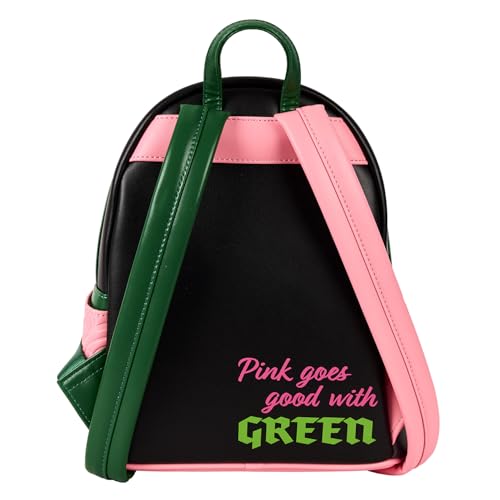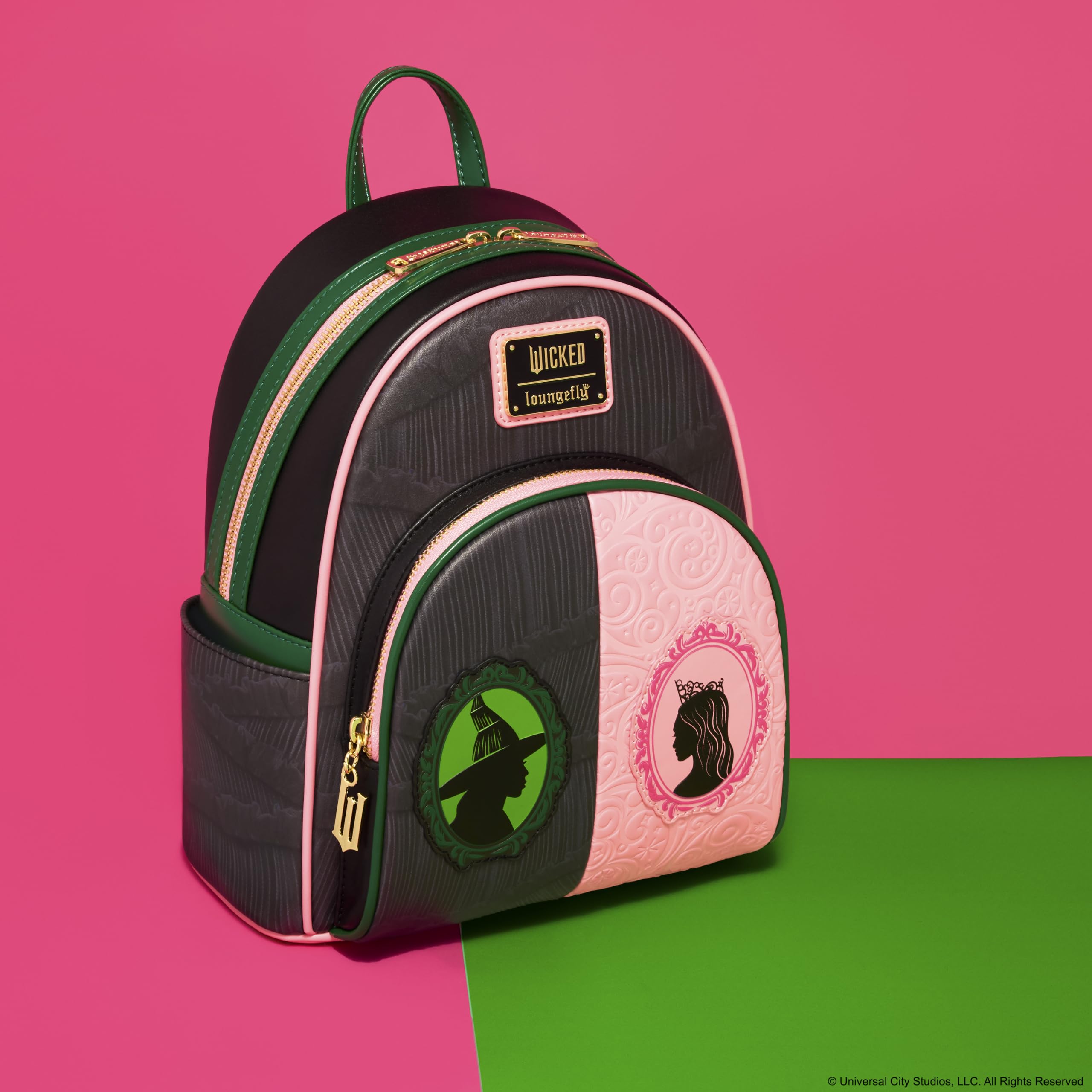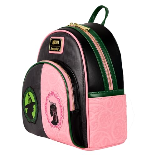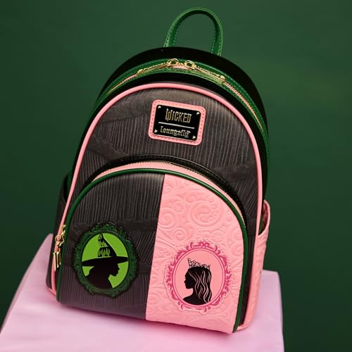 From Universal's Wicked, this mini-backpack features Glinda and Elphaba! Featuring incredible detail to bring Glinda and Elphaba to life, this Loungefly mini-backpack is made of vegan leather (polyurethane), has a front zipper compartment, side pockets, and adjustable back straps. Inside, the backpack continues the theme with unique, coordinating lining. Bring home a piece of Universal's Wicked today! "THIS ITEM IS NOT INTENDED FOR USE BY CHILDREN 12 AND UNDER"
