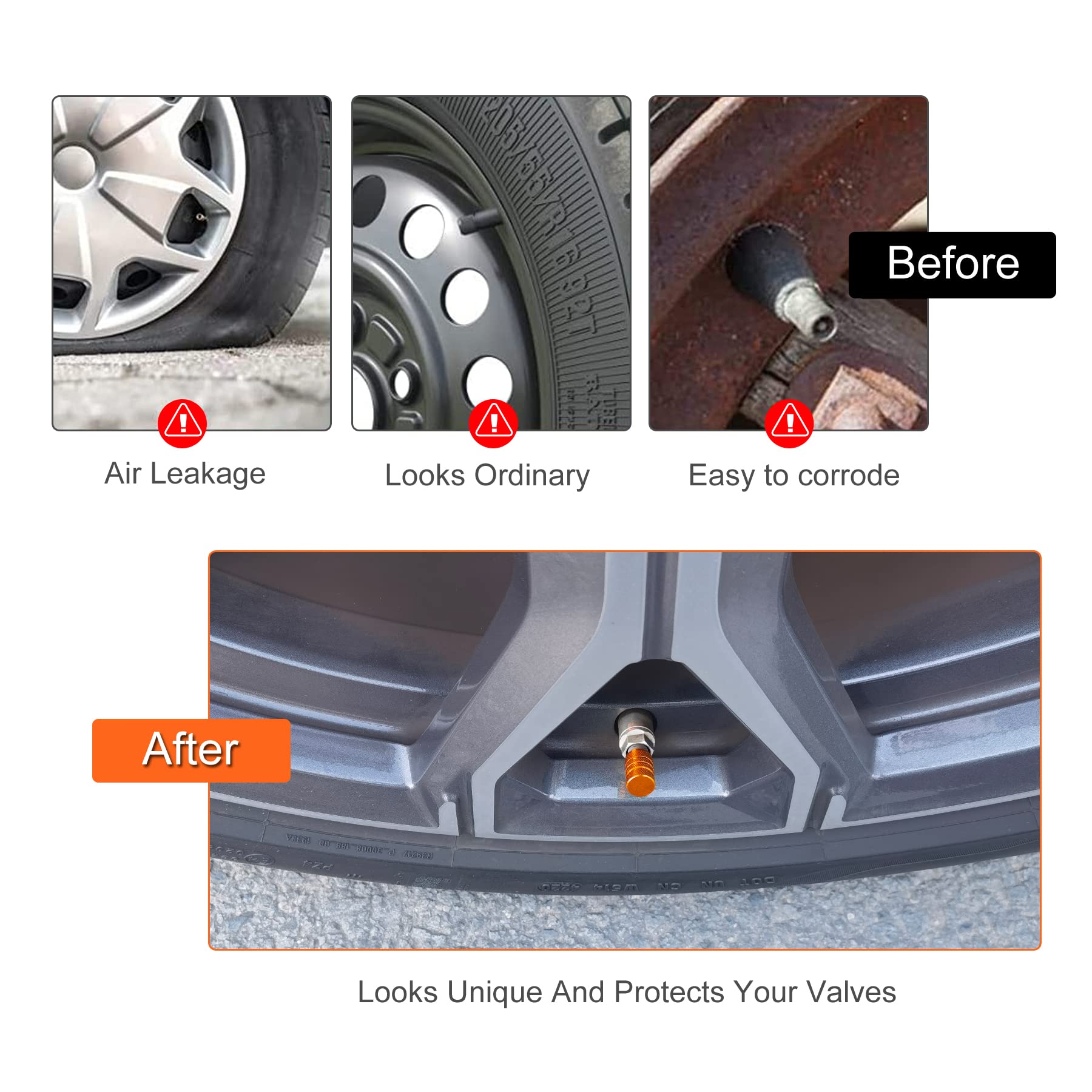 Easy installation: Simply screw the valve cover along the thread onto the valve stem, and the air valve cover will not be damaged during installation. Universal to most cars, trucks, motorcycles and bicycles.