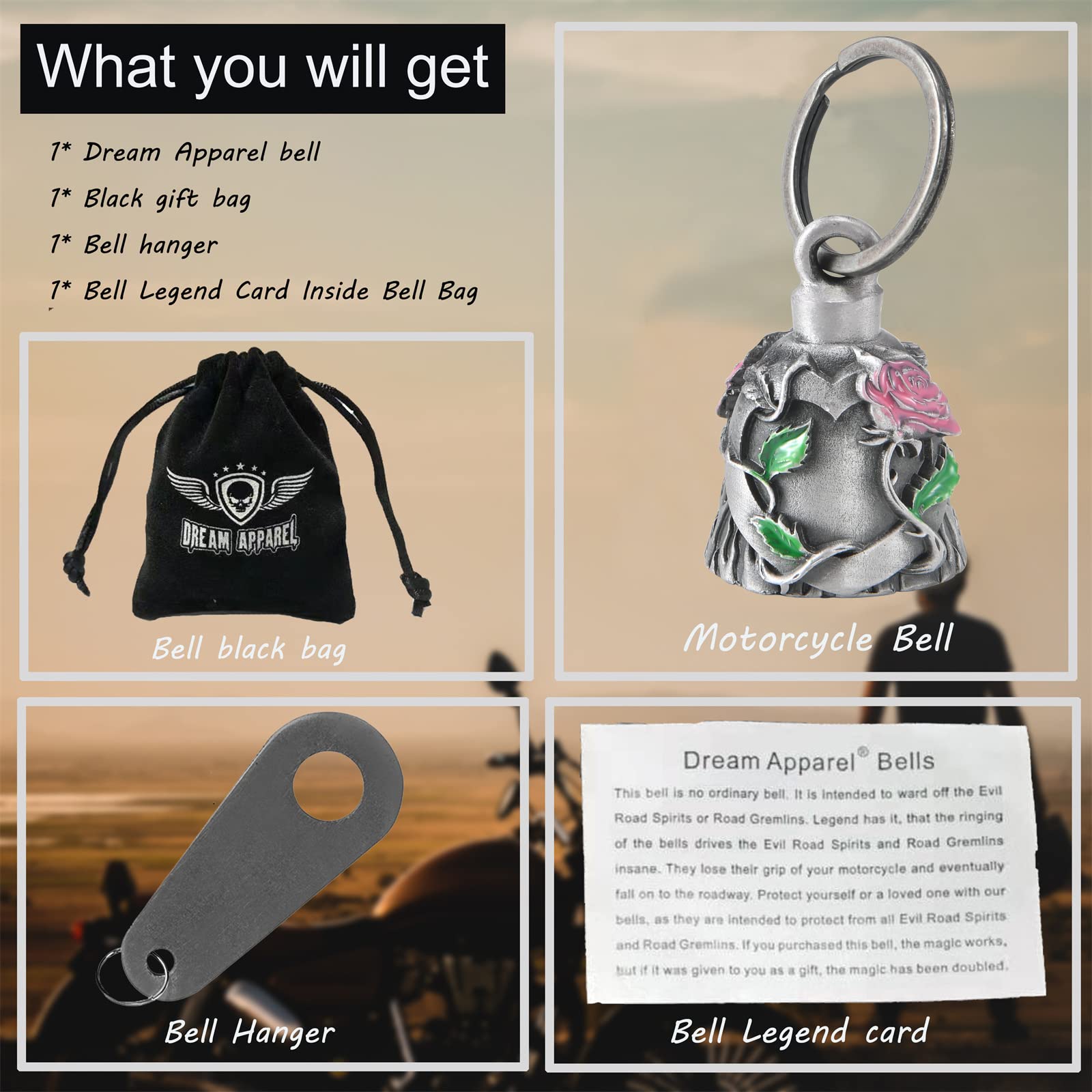 Large & Heavy:Each luck bell comes with 1 hanger+1 black gift bag+1 Legend of the Dream Apparel Bell story card,Measures: 2.75" tall ring include, 1.18"bottom wide. and weight 0.17lbs,heavy motorcycle bell keeps more sturdy while riding.