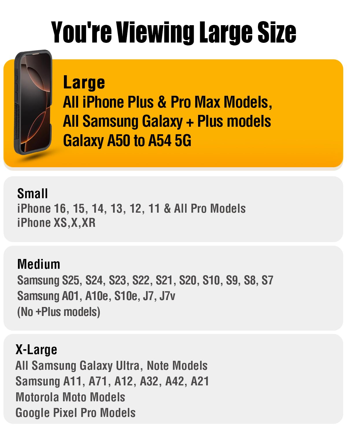 PiTau Large Size rugged black nylon vertical cellphone holster case with belt clip is designed for All iPhone Plus, Pro Max models, Samsung Galaxy +plus models and Galaxy A54 A53 A52 A51 A50. Enough room to fit the phones with protective cases on.