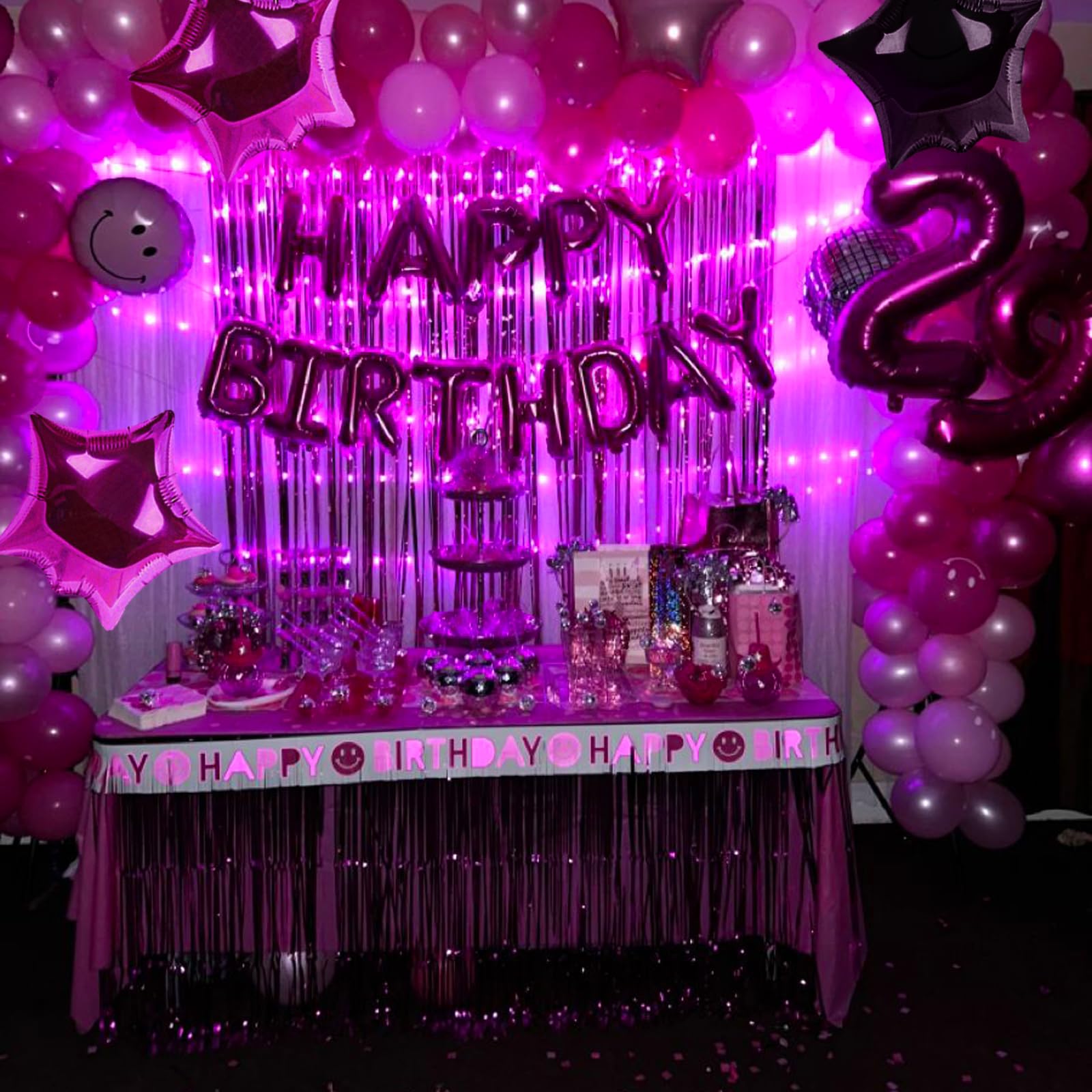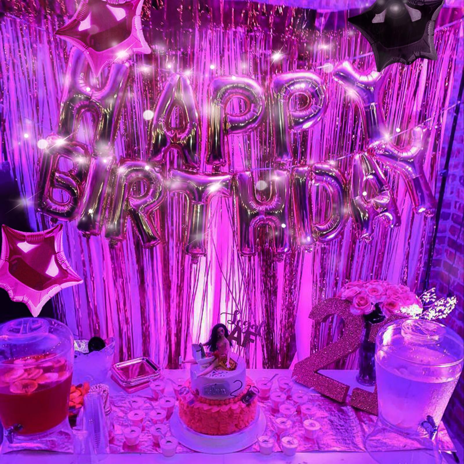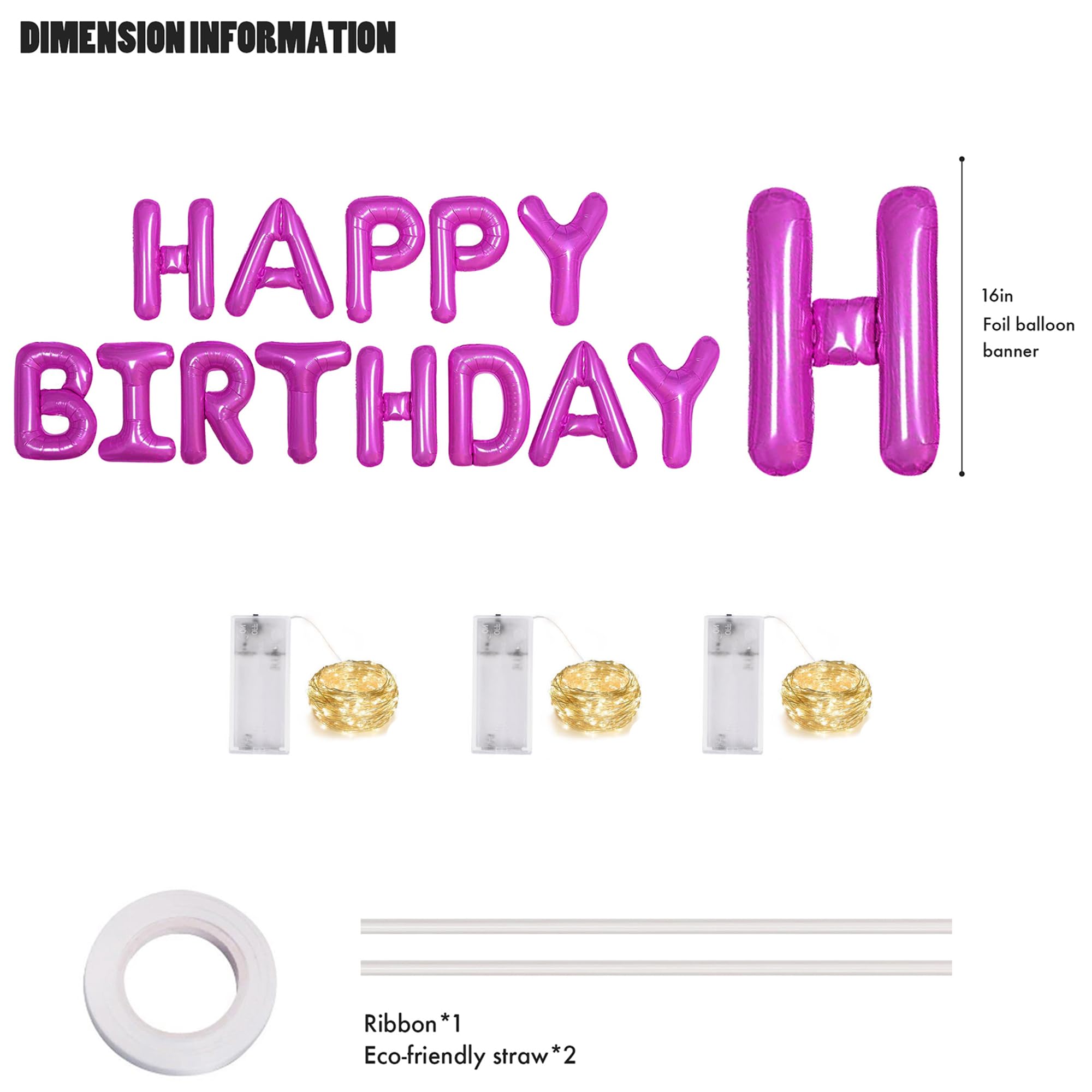 🎈 Package Included:16 inch Hot Pink foil letter happy birthday balloons.Each package come with 13 pcs independent letter balloons which can be combined into "HAPPY BIRTHDAY",2 pcs straw,1 pcs ribbon and 3*Led Light String in 118"(Battery not included).