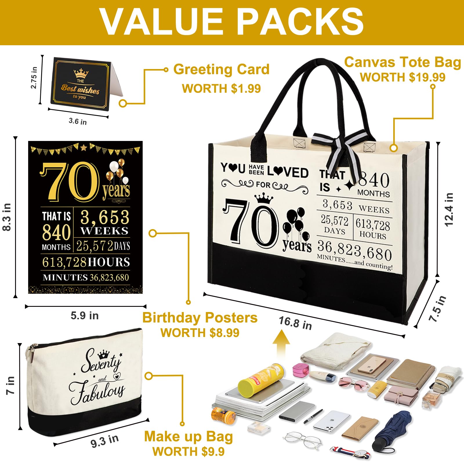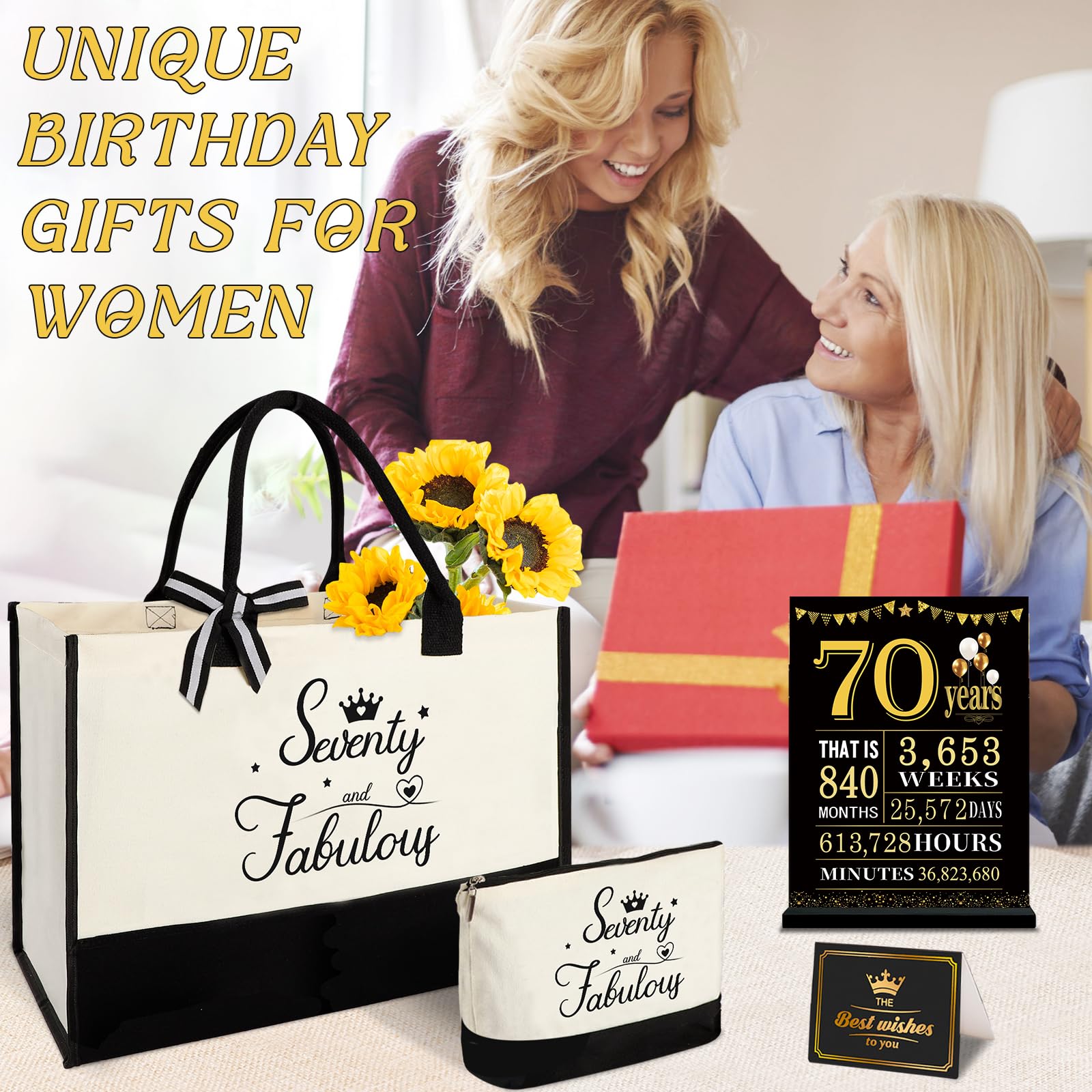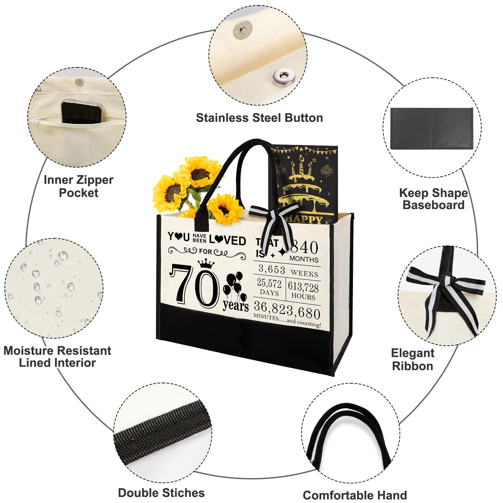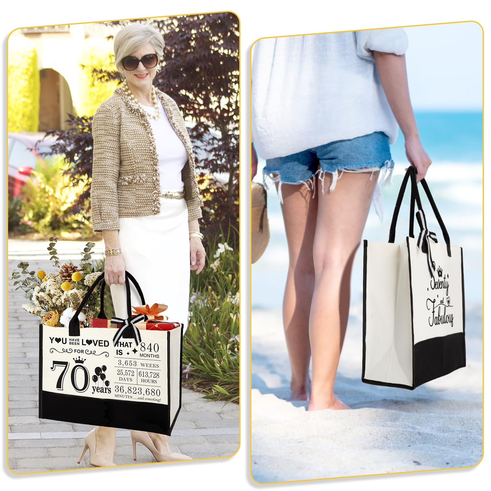 Great Gift for Her 70th Birthday: This gifts set for 70th birthday women contains: 1 X beach bag, 1 X makeup bag, 1 X greeting card. Unique canvas tote bag gifts set will be a adorable gift for women's 70th birthday. This birthday 70 gifts themed idea makes the perfect choice for putting a smile on her face on their special day.
