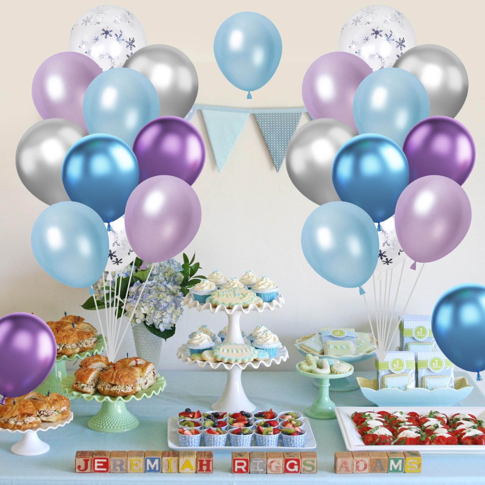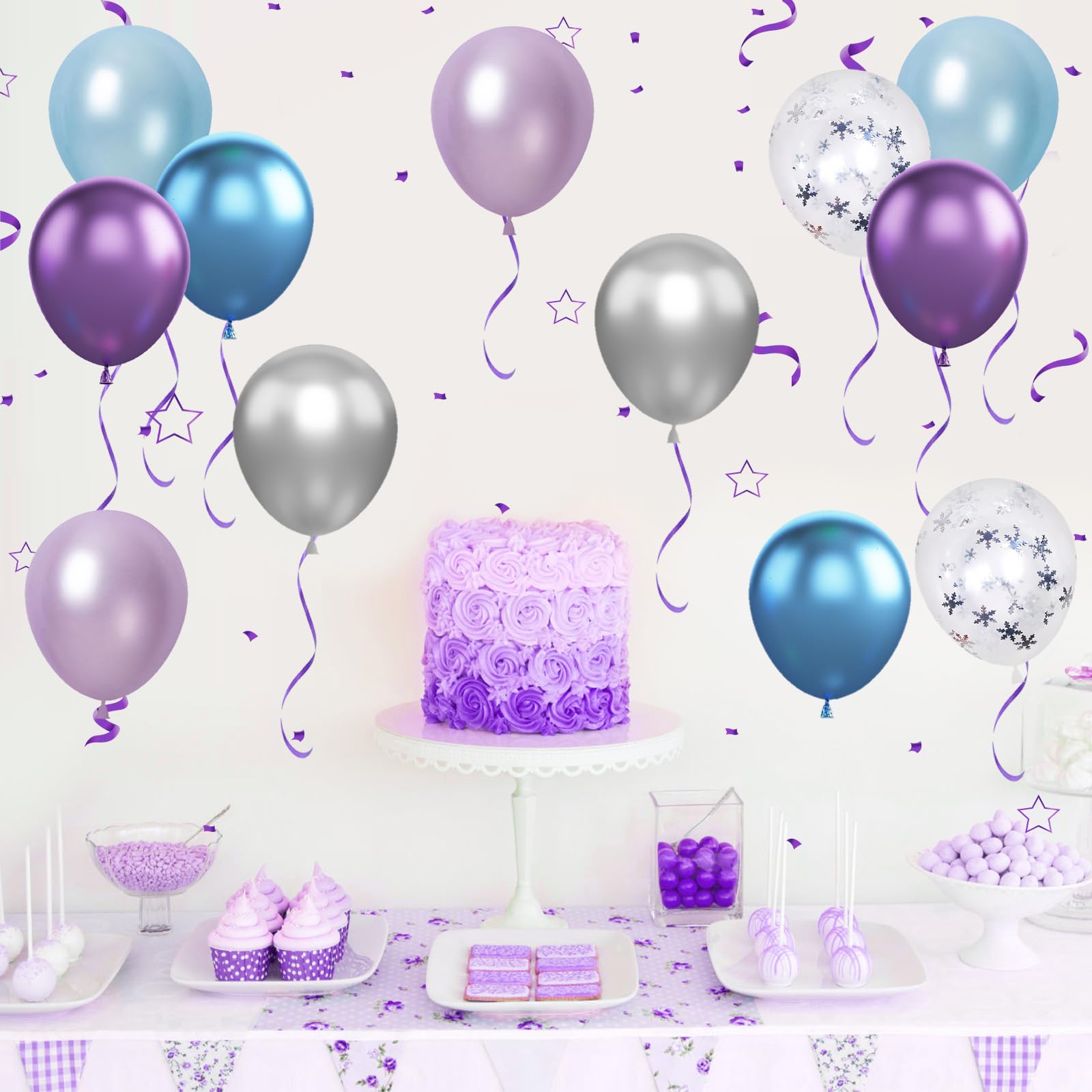 12 Inch Frozen balloons: Package content includes 4 pcs metallic purple balloons, 4 pcs metallic silver Balloons, 4 pcs metallic blue balloons,6 pcs purple balloons, 6 pcs snowflake Balloons, 6 pcs blue balloons, a balloon ribbon.