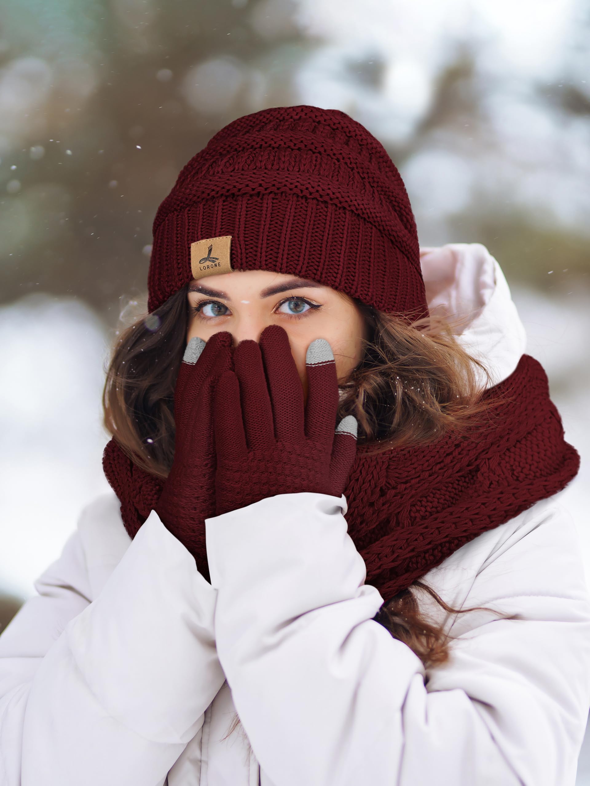 Novelty Design - The classic knitted pattern helps to enhance your face shape. Equipped with touch screen design on the thumb and index fingers, you can use your mobile devices without taking off your warm touch screen gloves.