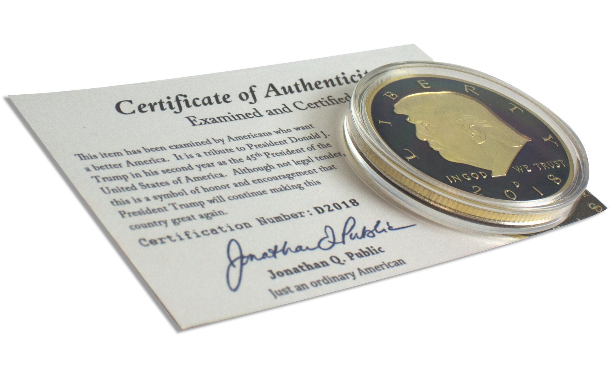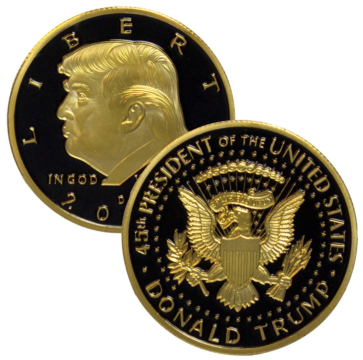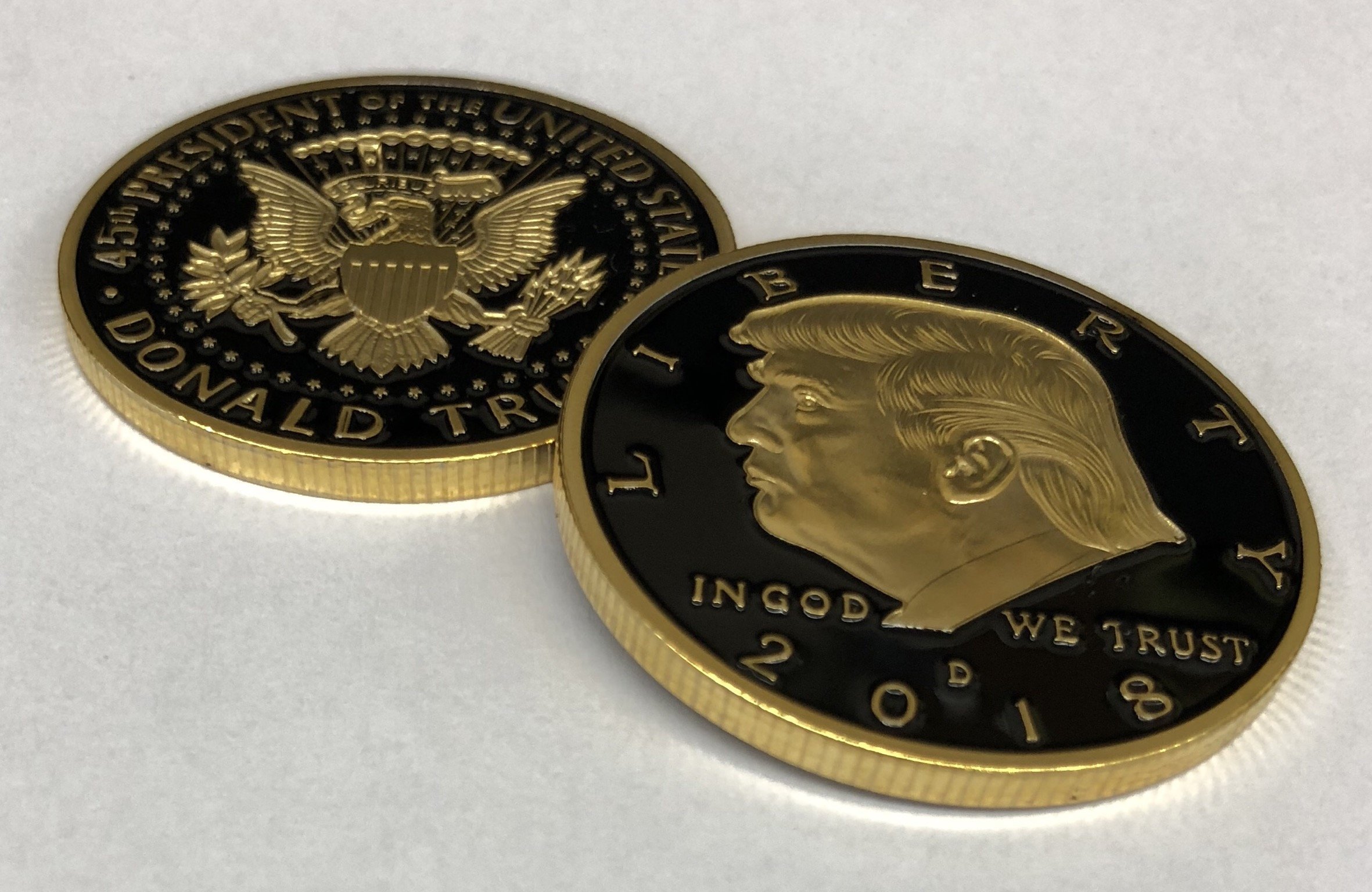 COLLECTIBLE. First edition, one of a kind 2018 Donald J. Trump gold coin for collectors is the perfect addition to your MAGA President Trump challenge coins, memorabilia, flags, hats, t-shirts, bobbleheads, and pens