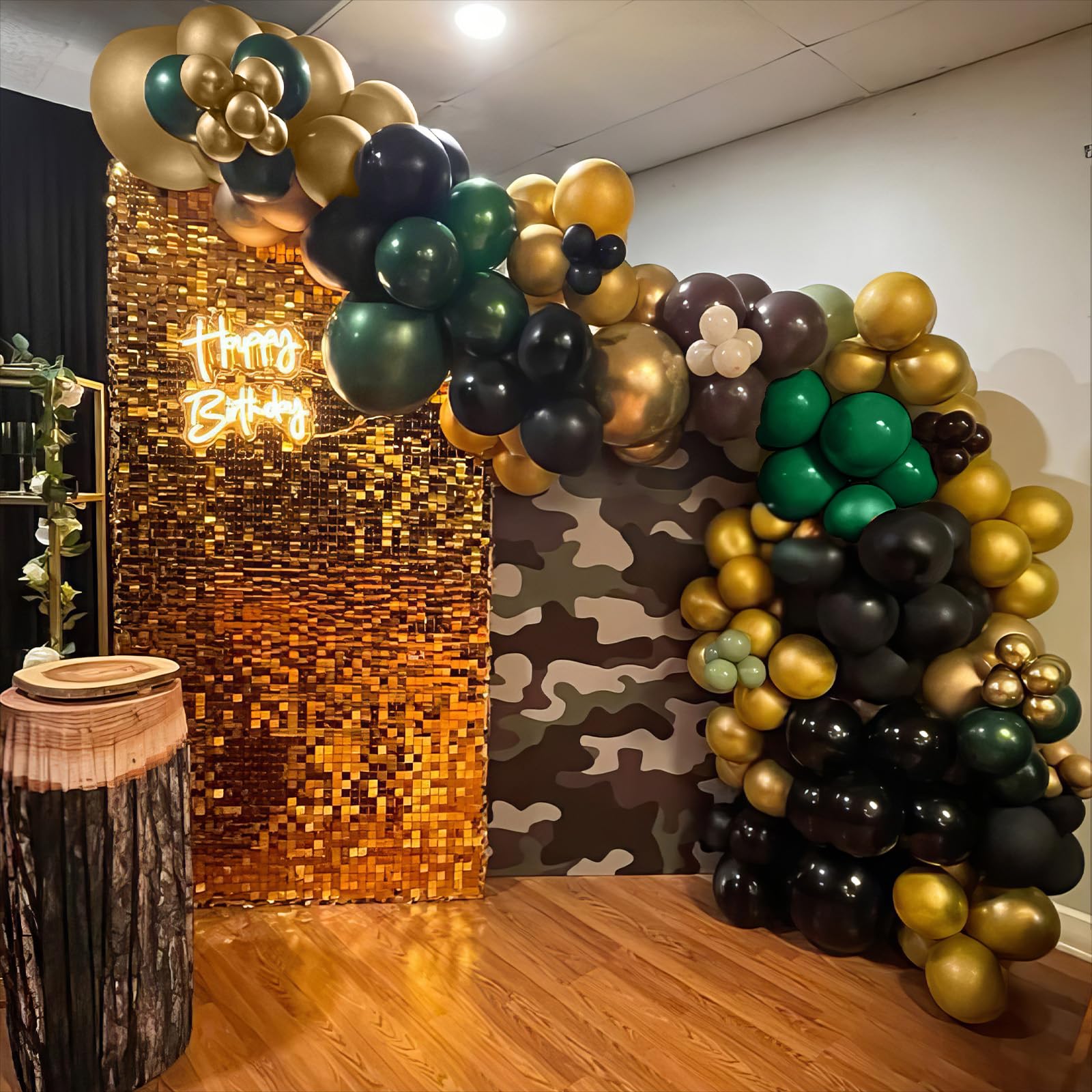 ใ12Inch Party Balloons Setใ: The green and brown balloons set includes 18pcs matte green balloons, 18pcs matte black balloons, 14pcs matte brown balloons, 10pcs metallic gold balloons, 1pc silver ribbon. 61pcs in total. Elevate your celebrations with our birthday party balloons!