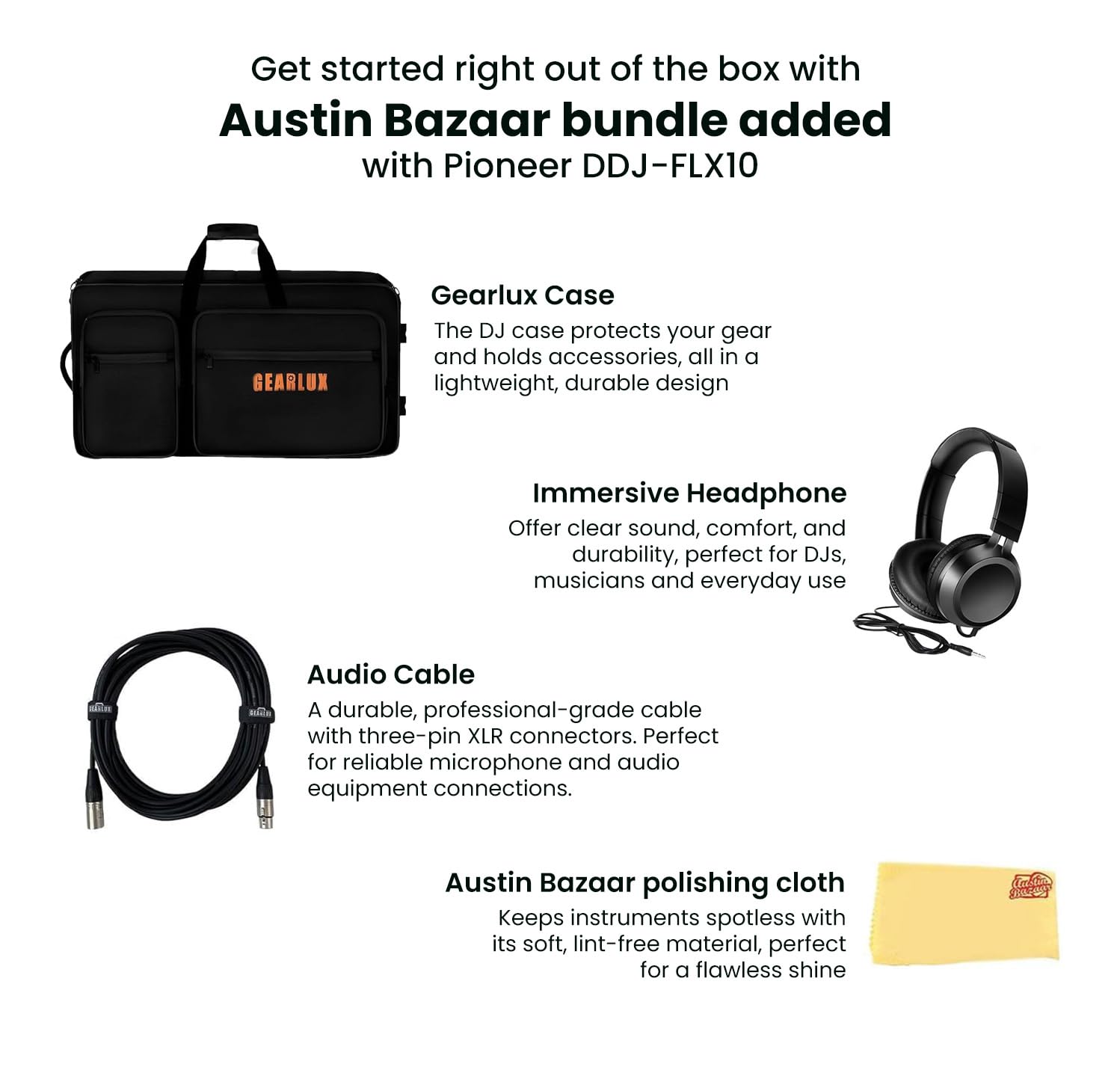 The Pioneer DDJ-FLX10 is a 4-channel DJ controller for rekordbox and Serato DJ Pro, featuring Stems technology that lets DJs easily remix tracks by controlling vocals, drums, and instruments separately. It has customizable jog displays that show useful information like waveforms and track artwork to help you focus on your performance. The Mix Point Link feature helps create smooth transitions between songs, and the built-in DMX output allows you to sync lighting effects with the music using rekordbox. With the precise Magvel Fader and multicolor jog ring for easy track management, the DDJ-FLX10 offers plug-and-play compatibility with both software platforms, DVS support, and the ability to personalize displays, making it a great choice for creative DJ sets. Width: 716 mm Depth: 400.3 mm Height: 73.4 mm Weight: 6.7 kg Soundcard: 24 bit/44.1 kHz Signal-to-Noise Ratio: 110 dB Distortion: <0.002 % (USB) Power Consumption: DC 12V, 3000 mA Frequency Range: 20 - 20000 Hz Austin Bazaar appreciates your purchase by adding necessary accessories. This bundle contains a case to keep your instrument protected, headphones for reliable audio monitoring, XLR microphone cable for a clear audio transferring and an Austin Bazaar polishing cloth to keep your instrument in mint condition.
