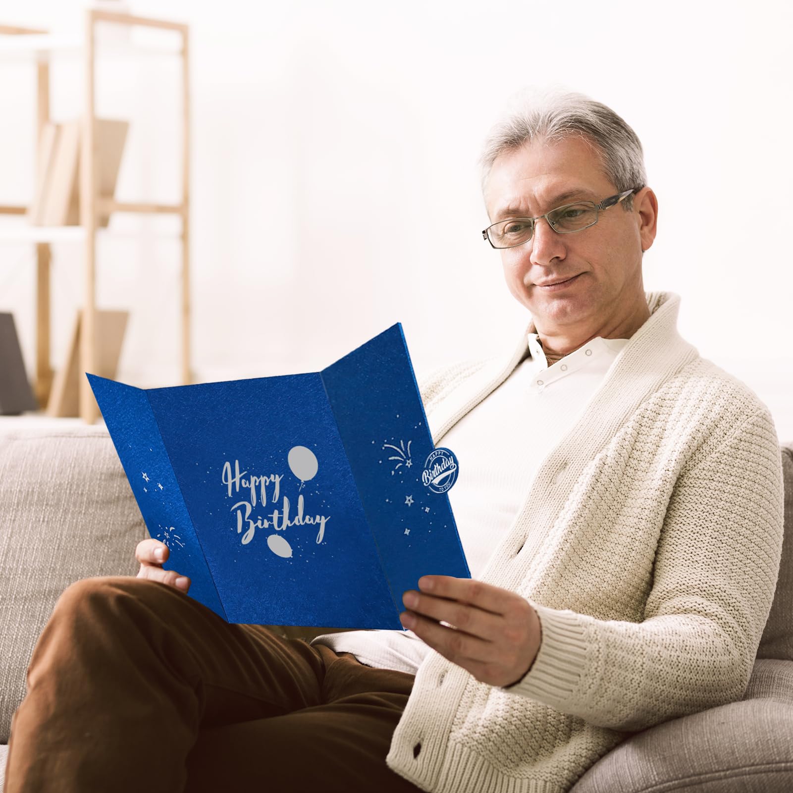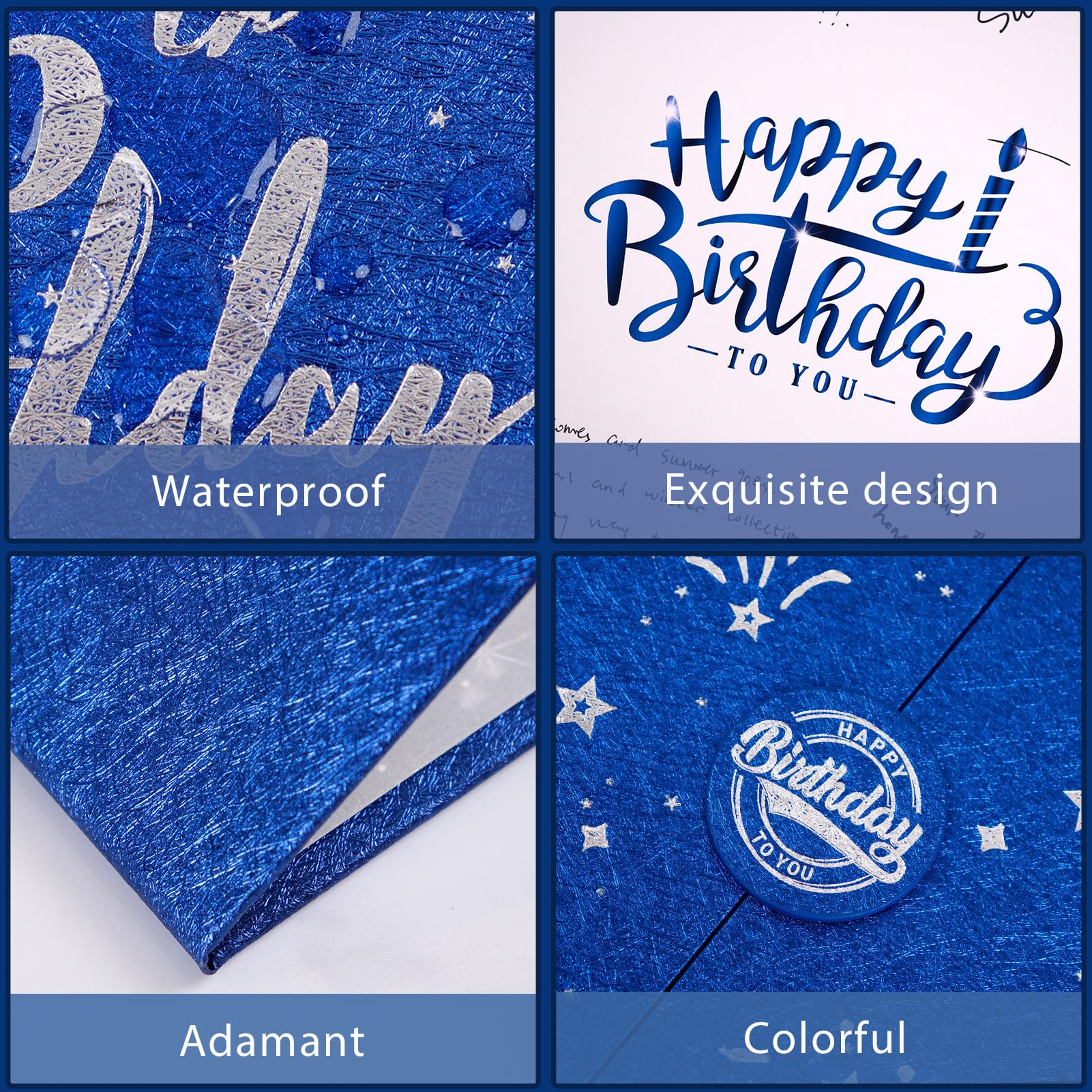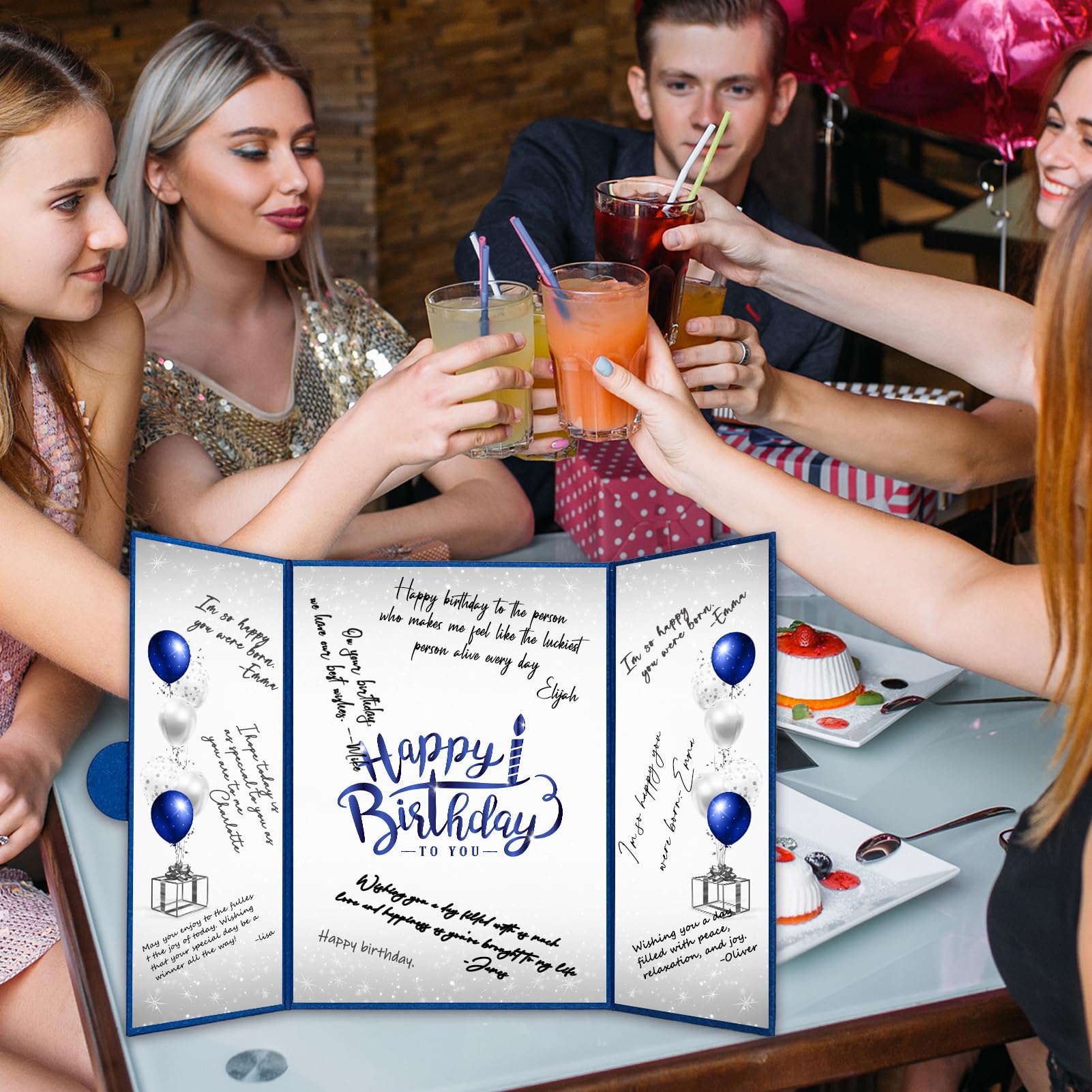 【Exquisite Design】- The blue and silver certificate has a gilded badge on the cover, and the inside of the signature certificate is divided into three parts, the middle page is printed with the message 'Happy Birthday TO YOU'. This birthday signature board can be opened directly and stand on the table. Tips: Without pen.