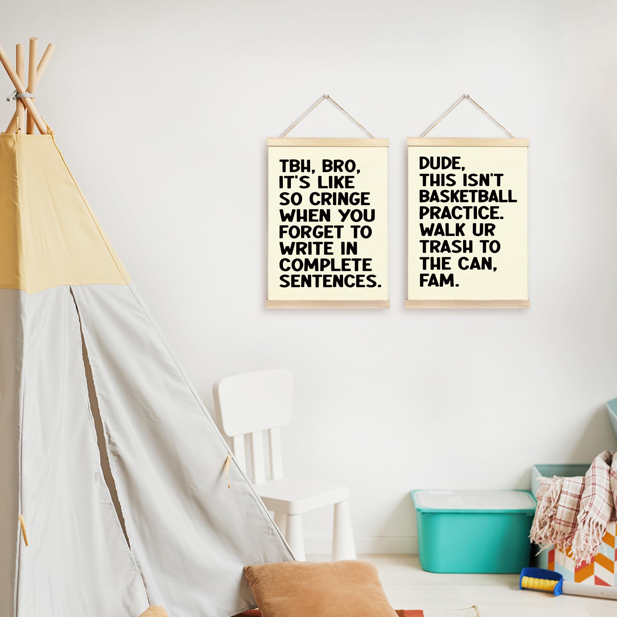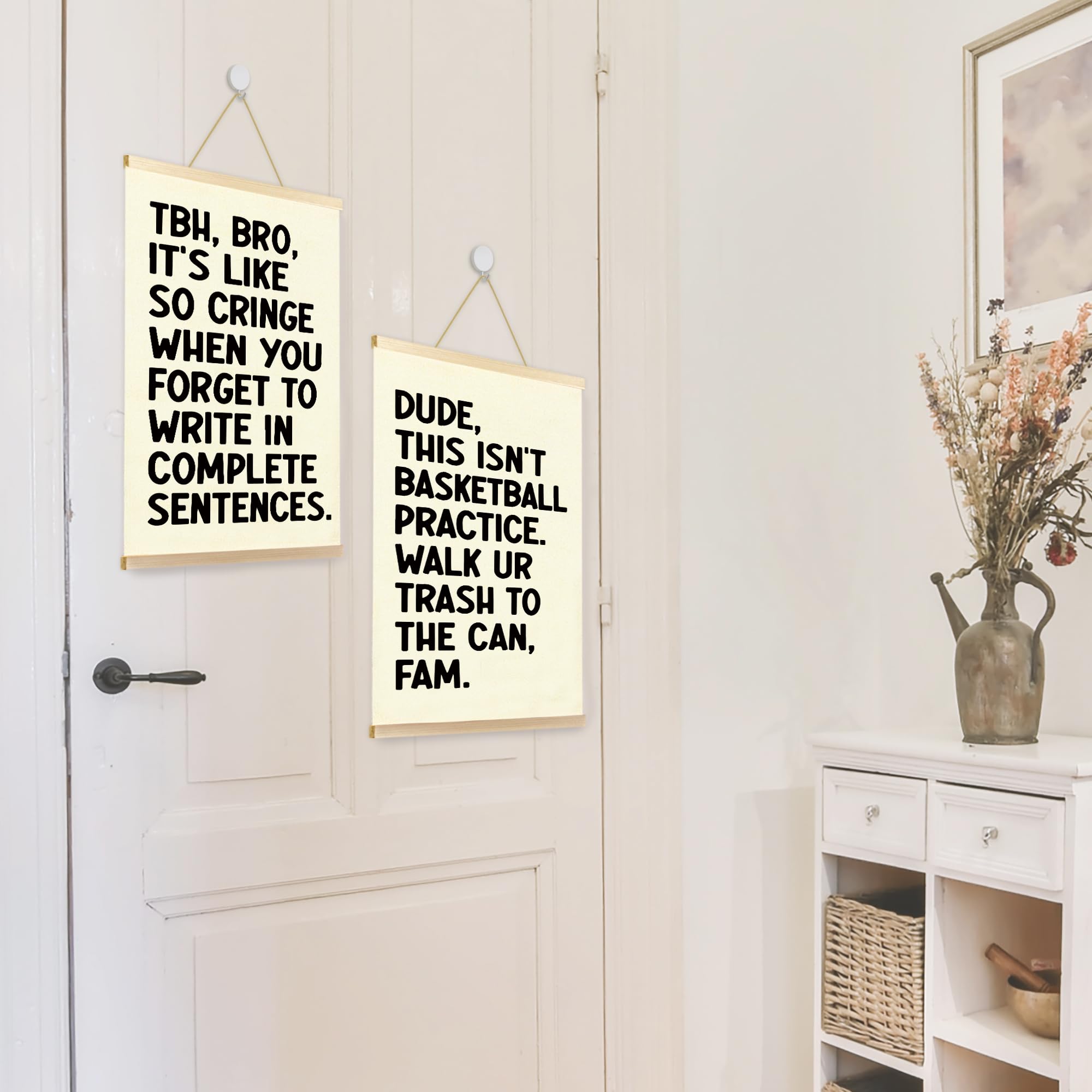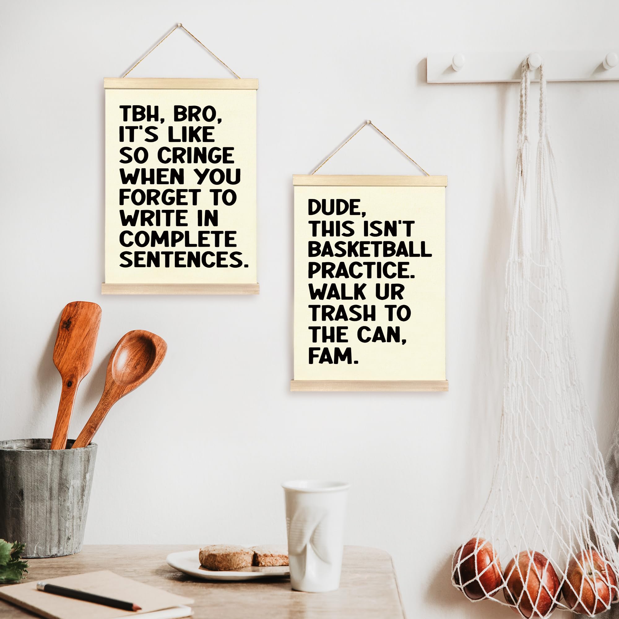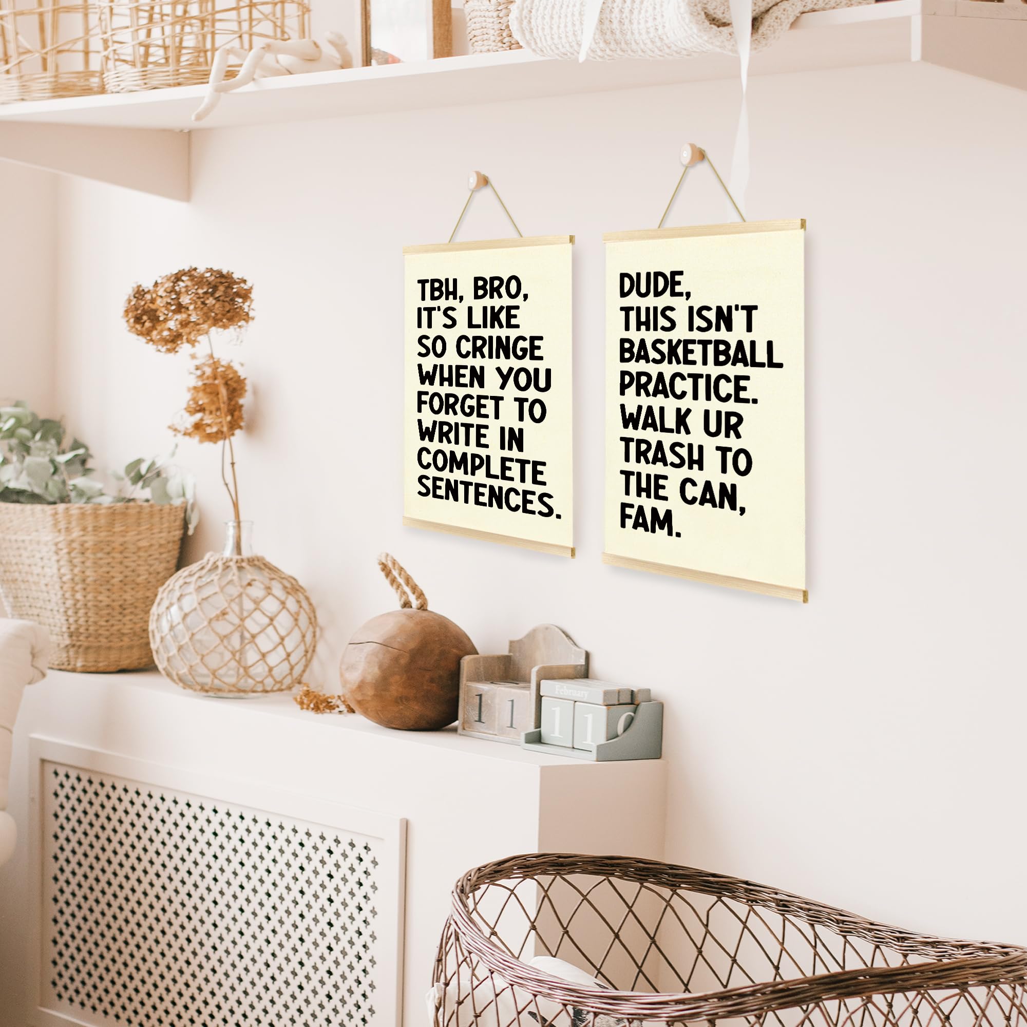 Printed on natural linen fabric with solid wood bars on top and bottom. The wooden frame provides durability, and the linen material enhances the overall aesthetic appeal.