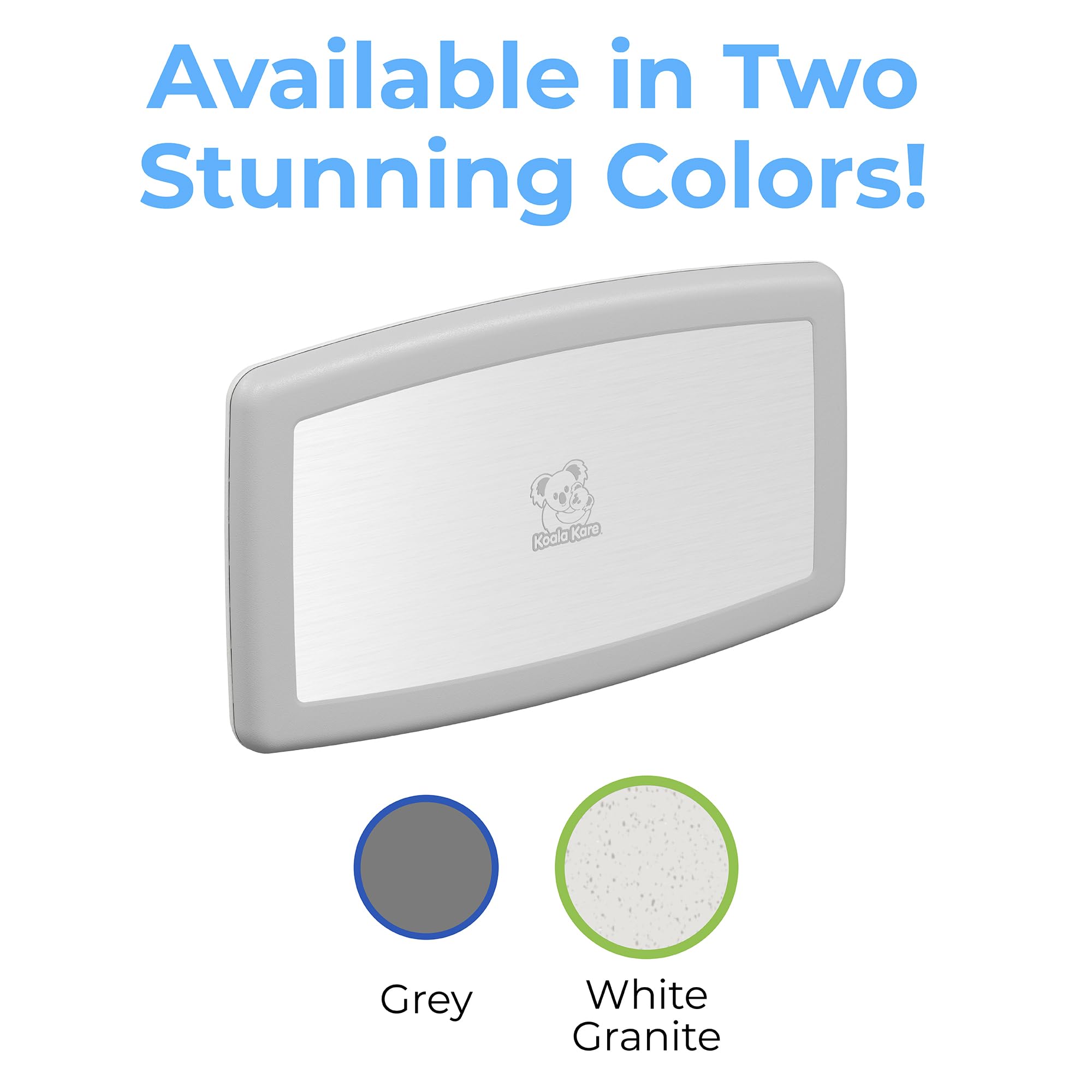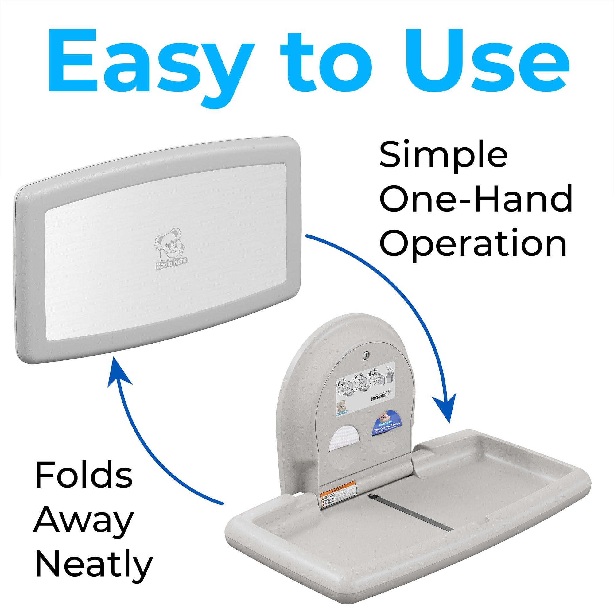 Available in two stunning colors with each providing a modern visual aesthetic. Thoughtful patron amenities enhance the end-user experience, and include Microban® product protection, a redesigned liner dispenser, a convenient external solid stainless steel rod bag hook with satin finish and the Koala brand mark that communicates comfort to families and the promise of a thoughtful accommodation. The dual liner cavity has an internal spring tab that pushes liners forward while only allowing single liner dispensing. Each cavity holds 25 liners and locking mechanism minimizes operator refills and discourages potential vandalism. The product includes child protection straps. The external stainless steel bag hook is for safely storing a diaper bag off the floor and keeping the diaper bag in close proximity to the caregiver for ease of use. Bed surface exclusively contains Microban® product protection that helps keep the bed surface fresher between cleanings. Concealed ventilated cylinder provides controlled, slow opening and closing of the changing station bed.