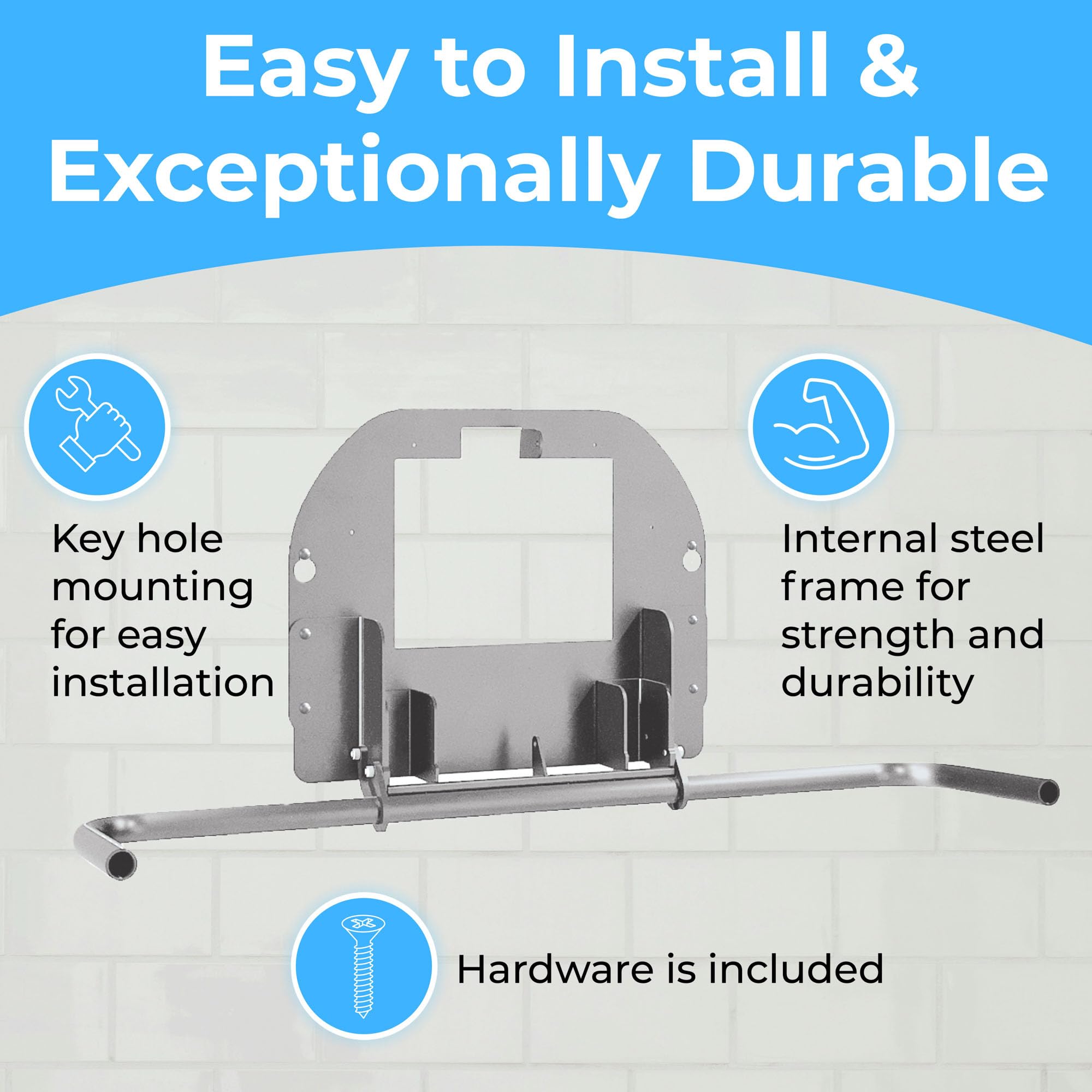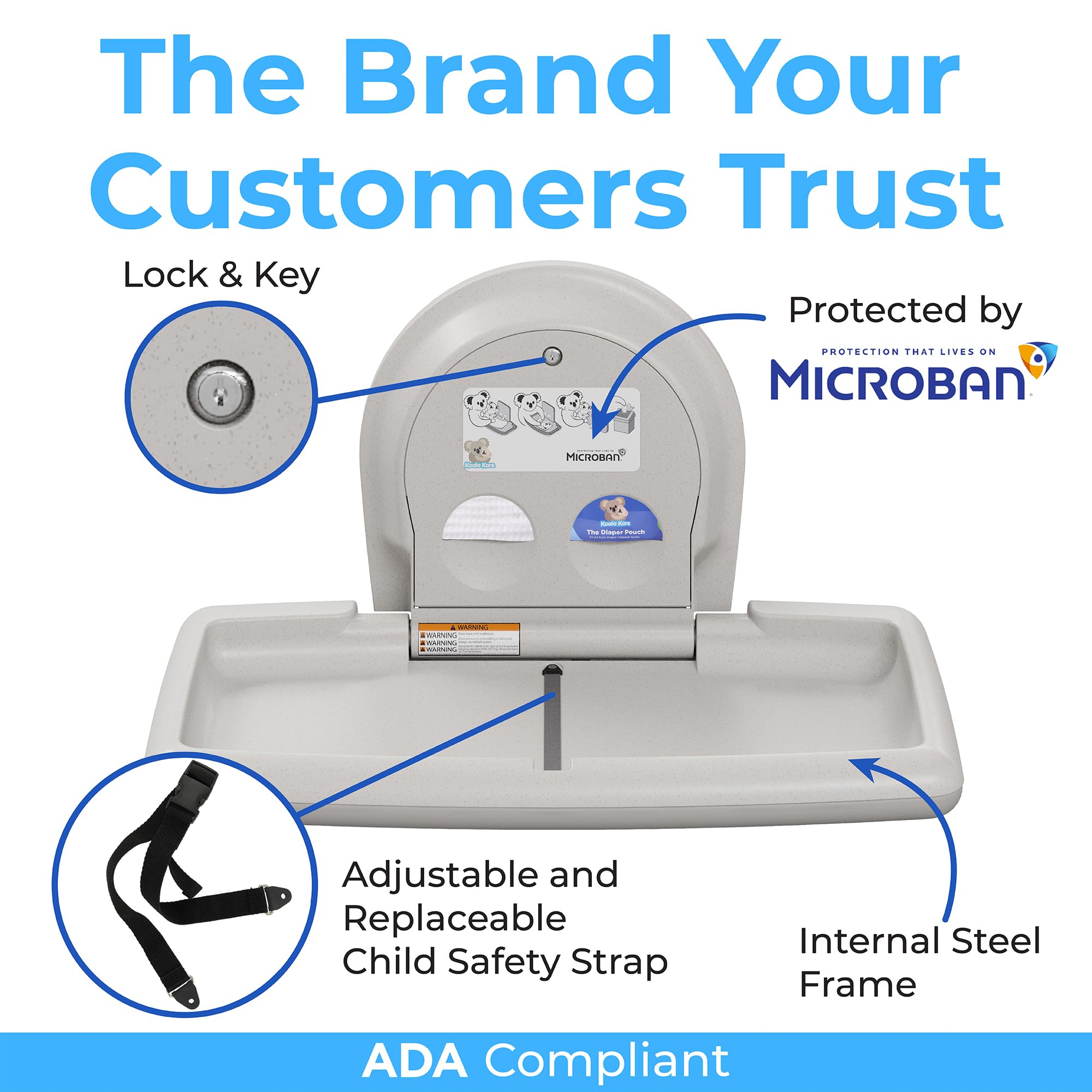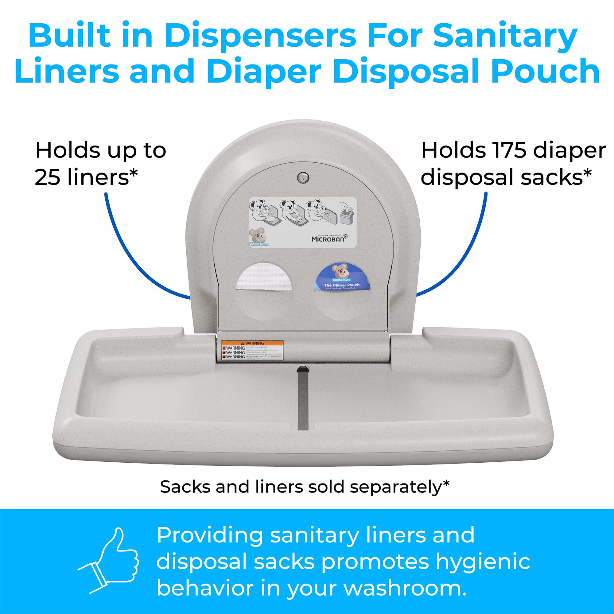 User-Friendly Convenience: Equipped with dispensers for easy access to sanitary liners and diaper disposal sacks. As well as a stainless bag hook that mounts on wall next to station for safe and easy access to diaper bags and purses.