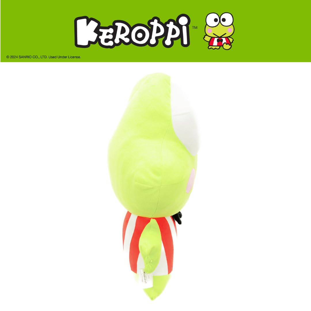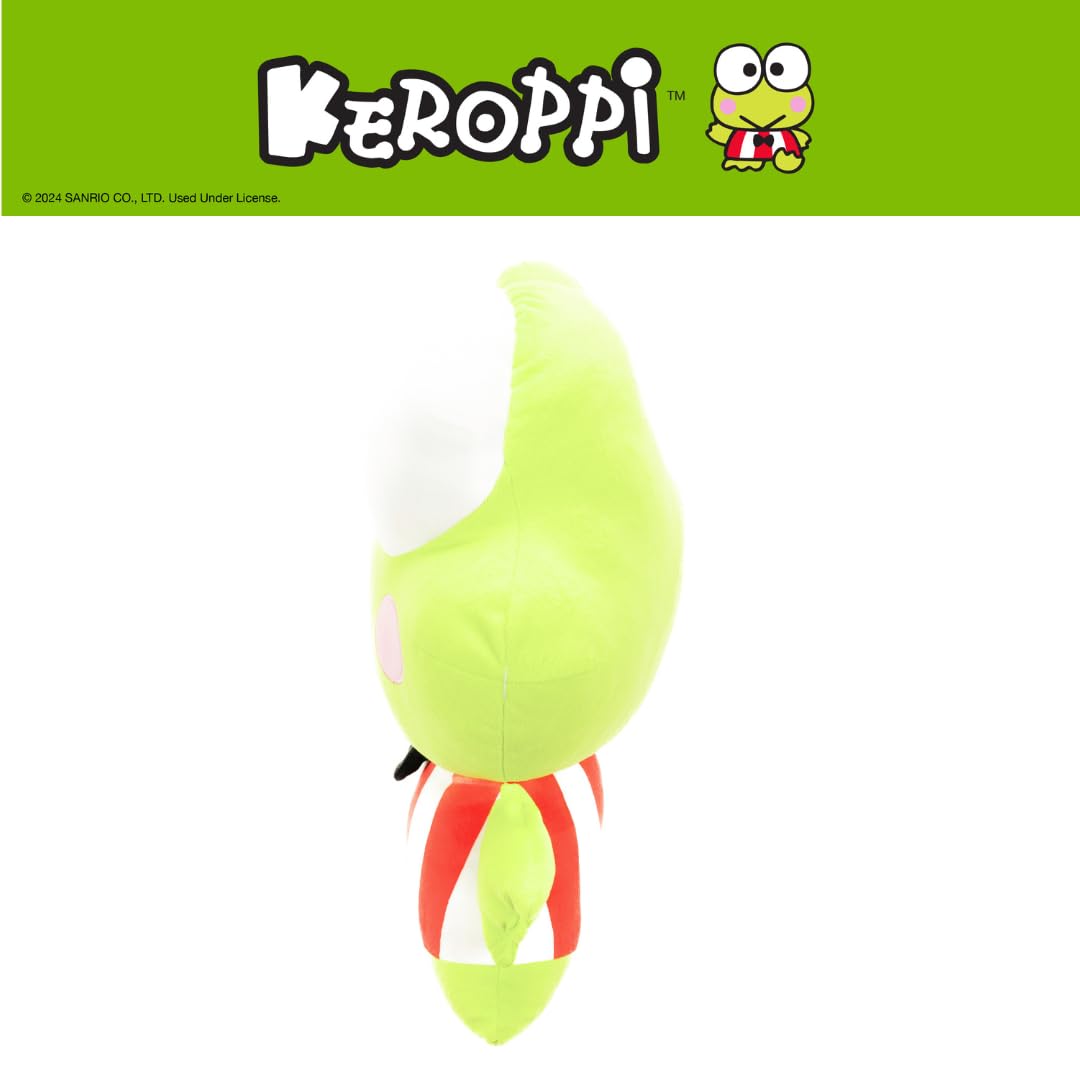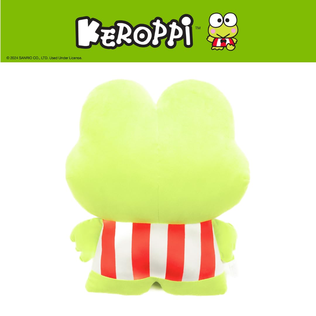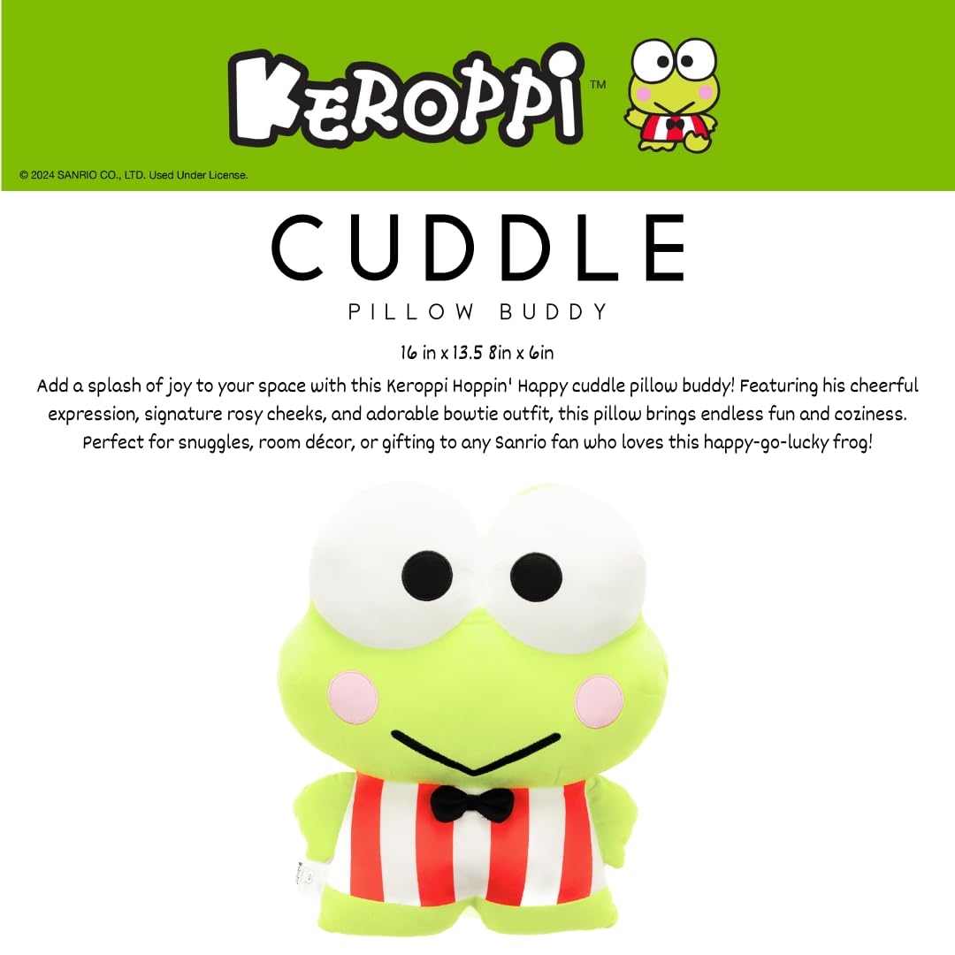 KEROPPI DESIGN: Add a splash of joy to your space with this Keroppi Hoppin' Happy cuddle pillow! Featuring his cheerful expression, signature rosy cheeks, and adorable bowtie outfit, this plush brings endless fun and coziness. Perfect for snuggles, room décor, or gifting to any Sanrio fan who loves this happy-go-lucky frog!