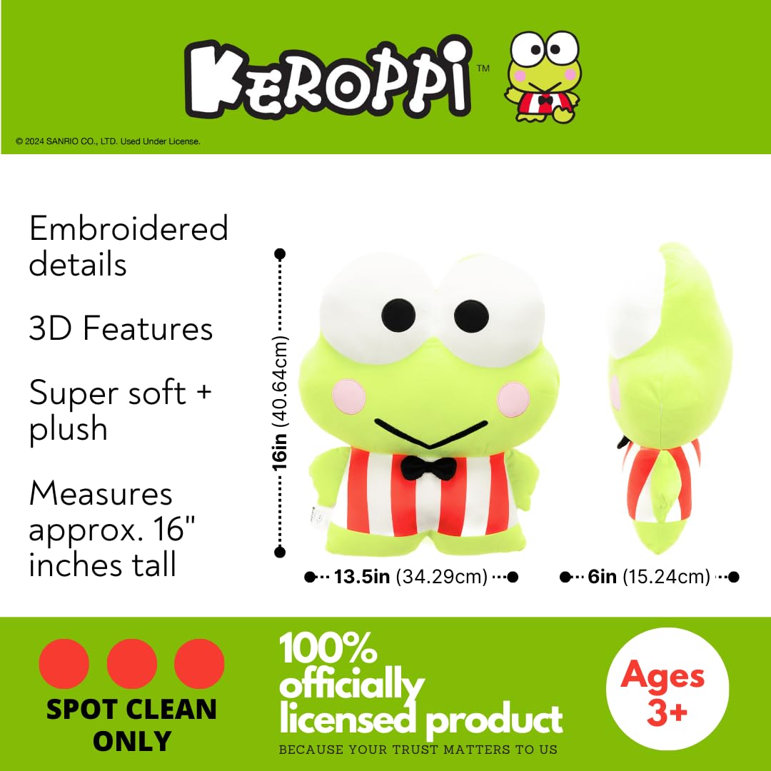 ITEM INCLUDES (FOR AGES 3 AND UP): A Keroppi shaped plush cuddle pillow that measures approximately 16 in x 13.5 8in x 6in. The perfect size to snuggle up for any Sanrio fan!