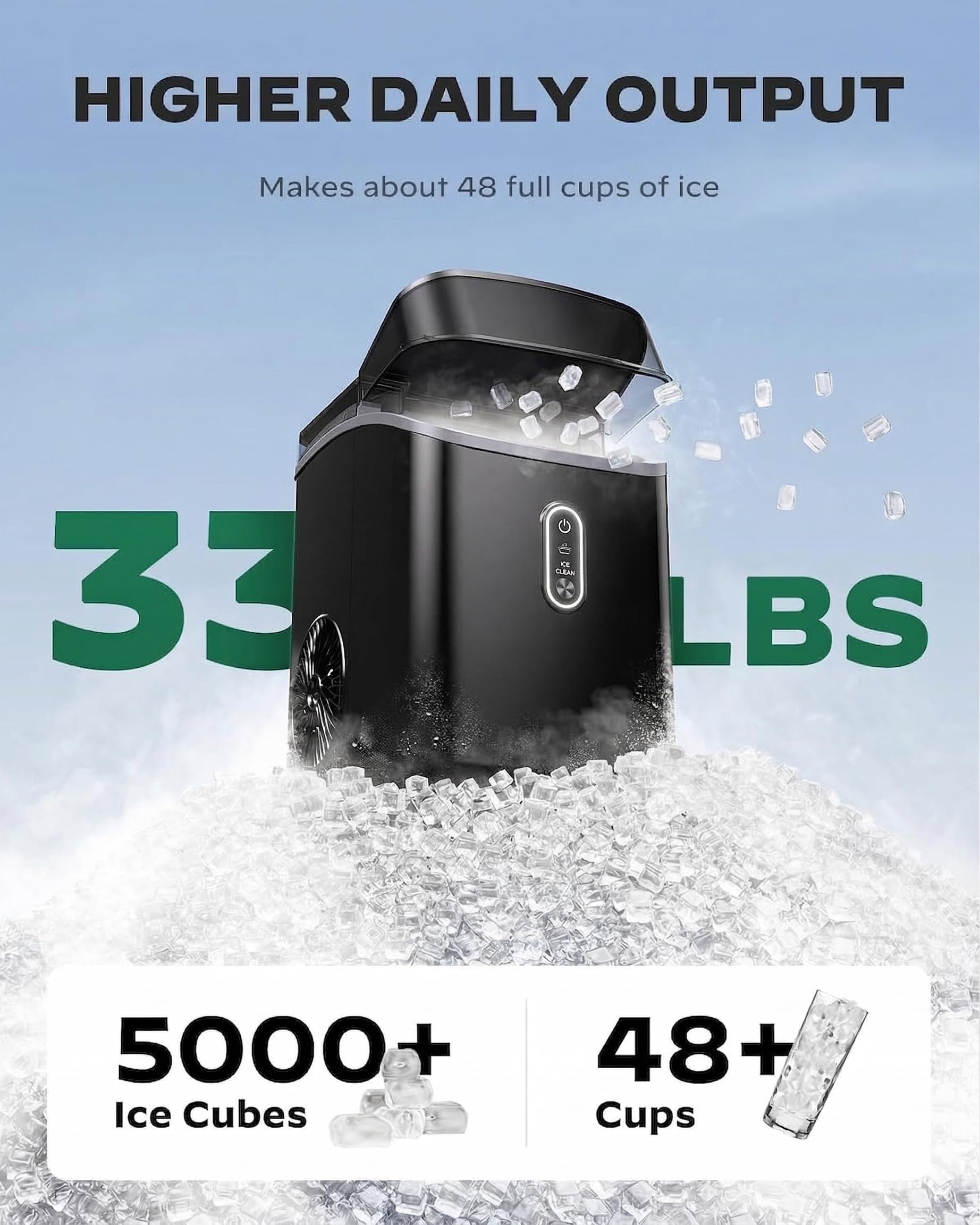✔Effective Ice-Making: The daily output of 33 lbs is about 48 cups (8.5 fl oz) full of nugget ice. It easily meets the needs of large families and parties. Make great iced tea, coffee, or cocktails. Even chill beers and keep food fresh.
