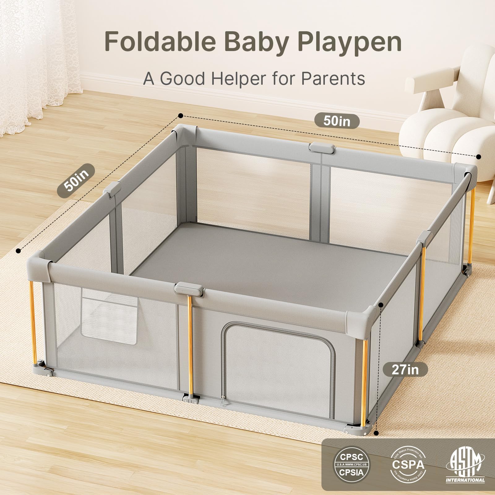 【Foldable Baby Playpen】The 50"x50" foldable playpen features an innovative folding design, making it easy and quick to disassemble and assemble. It takes only 1-3 minutes to set up the playpen for babies and toddlers by yourself. The included storage bag ensures neat compact storage, saving both space and hassle for busy parents. Please note: To avoid any inconvenience, please measure your space beforehand and select the fence that matches your measurements