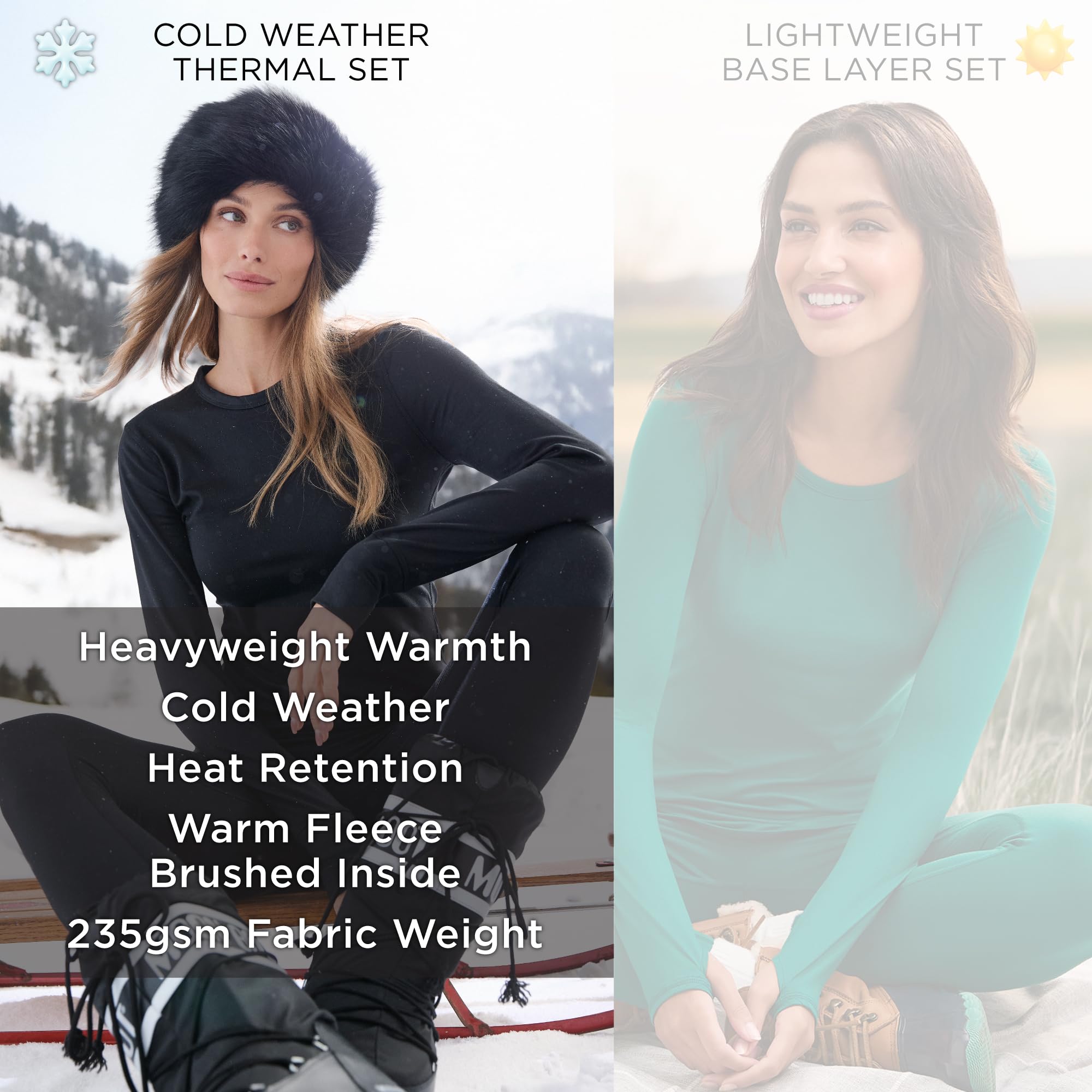 COLD-WEATHER READY: With a fabric weight of 235 GSM, this heavyweight thermal set for women is perfect for colder days. It’s warmer and more substantial than our lightweight everyday active base layer set. The brushed fleece interior helps retain body heat, while moisture-wicking and breathable fabric technology work together to absorb and evaporate moisture - keeping you warm, dry, and comfortable all day long.