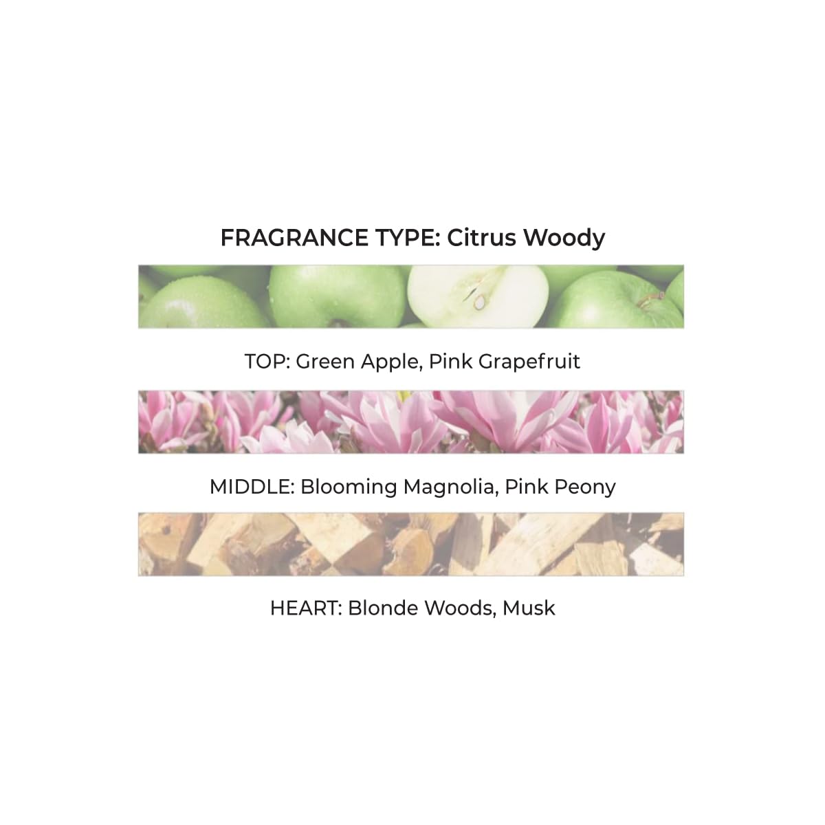 “Ah, romance, exquisite romance!” -Emily Crisp green apple opens to a softly feminine pink peony and blooming magnolia. Velvety blonde French woods with a hint of seductive musk beckons with soft abandon. Fragrance Type: Citrus Woody Top: Green Apple, Pink Grapefruit Middle: Blooming Magnolia, Pink Peony Heart: Blonde Woods, Musk