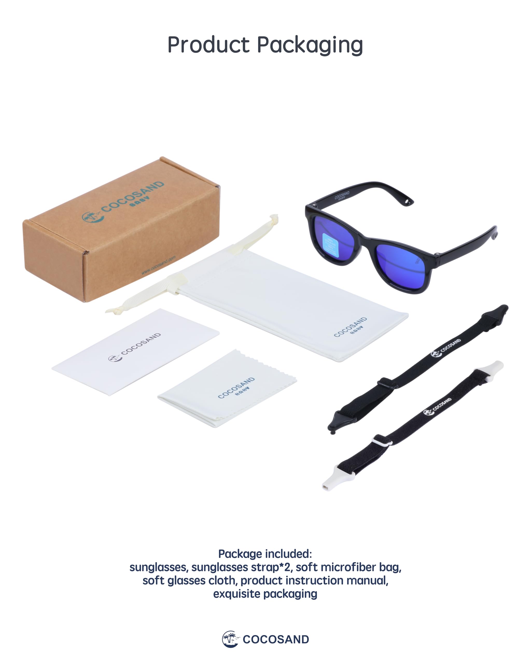 Package Includes: 1 pair of sunglasses, 2 adjustable straps,1 glasses pouch, 1 cleaning cloth, an instruction manual, and a sunglasses storage box. Sunglasses, accessories and packaging are all recyclable. Advocate the creation of a better ecological environment and refuse to overdraw the earth's resources