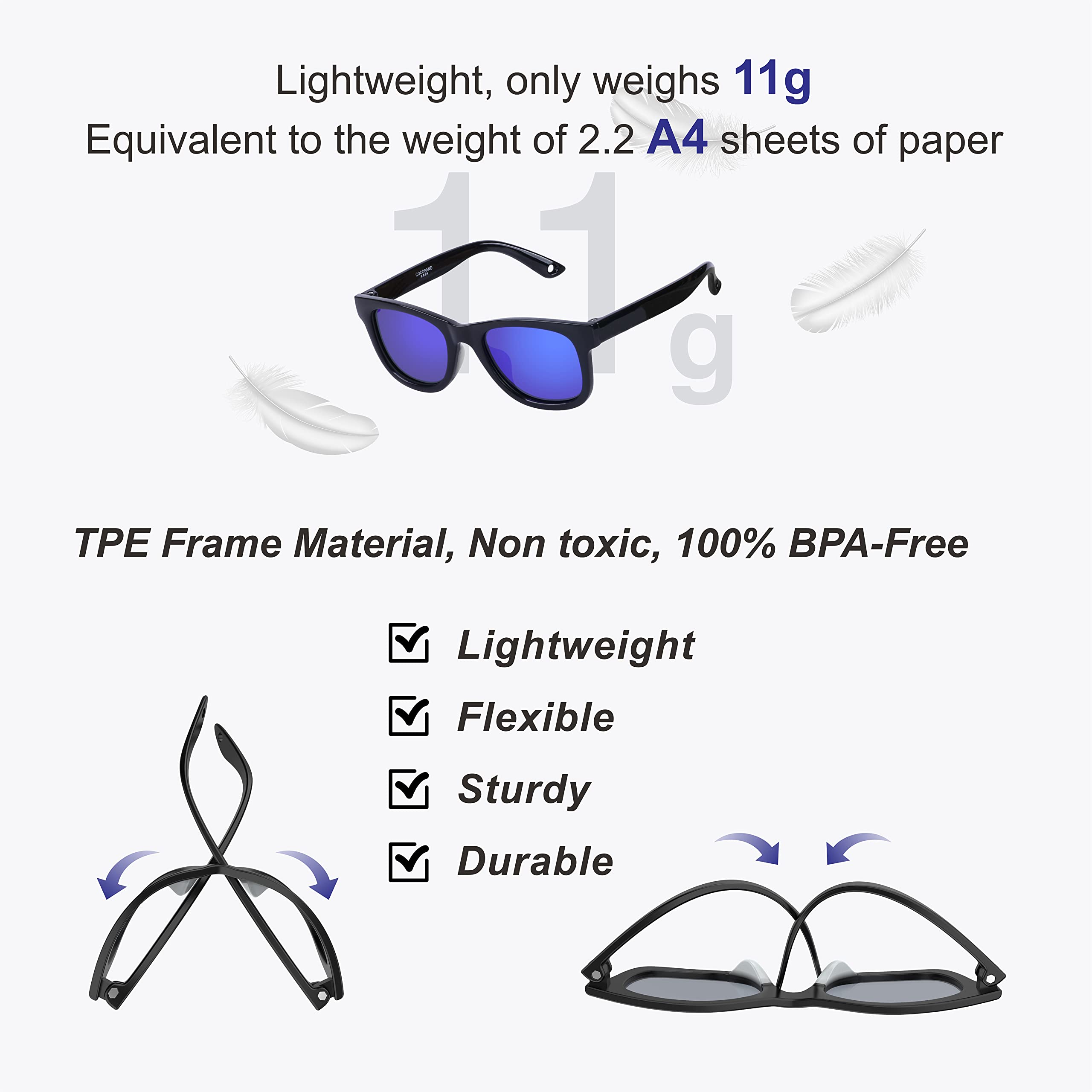 Lens: Polarized lenses. Blocks UVA, UVB and harmful blue ray. HD vision, Glare Free. Wearing it in outdoor activities can reduce eye fatigue, reduce the damage caused by sunlight to baby's eyes