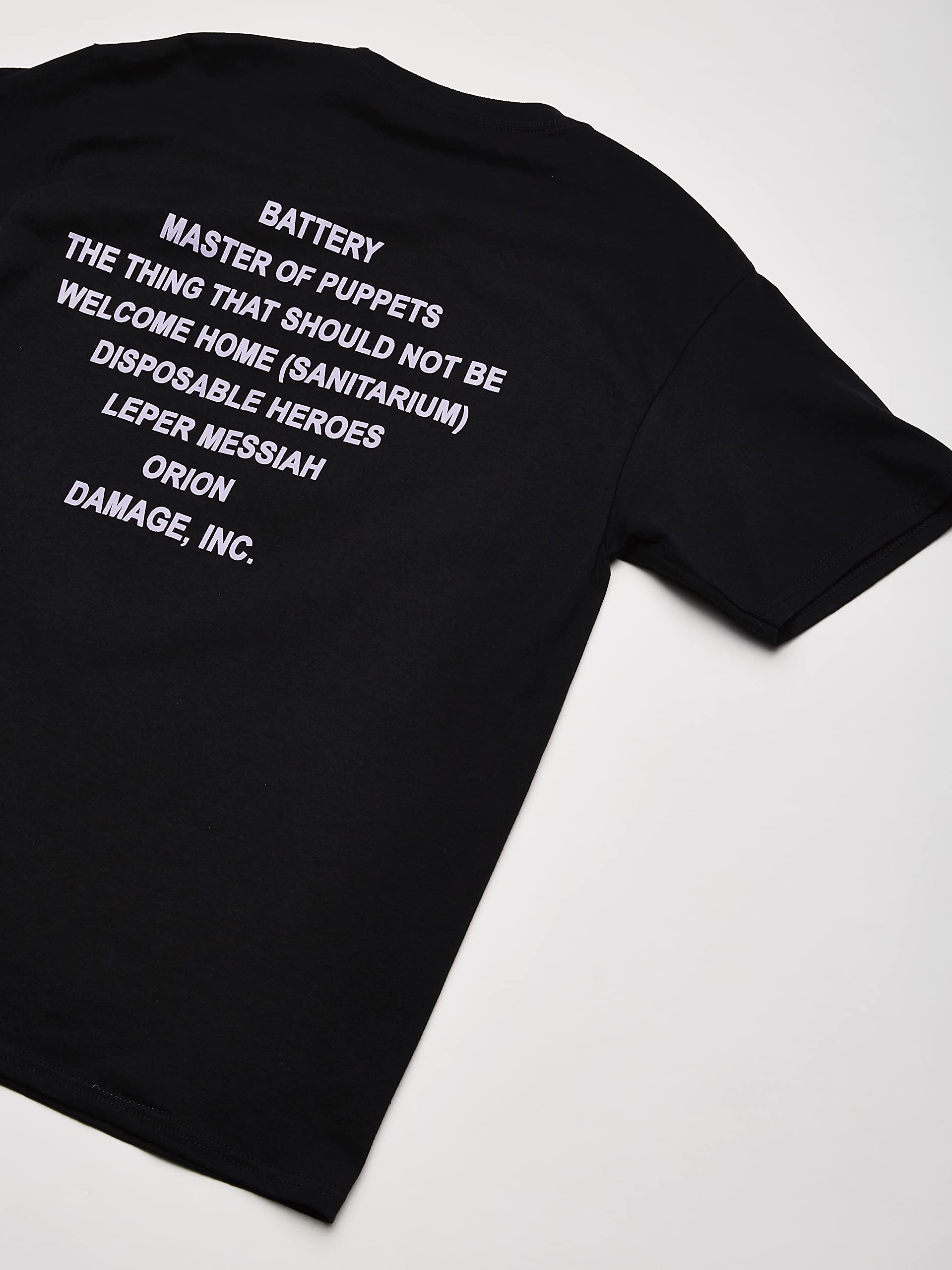 Description Black t-shirt featuring Master of Puppets graphic underneath Metallica logo on front and Master of Puppets lyrics on the back.