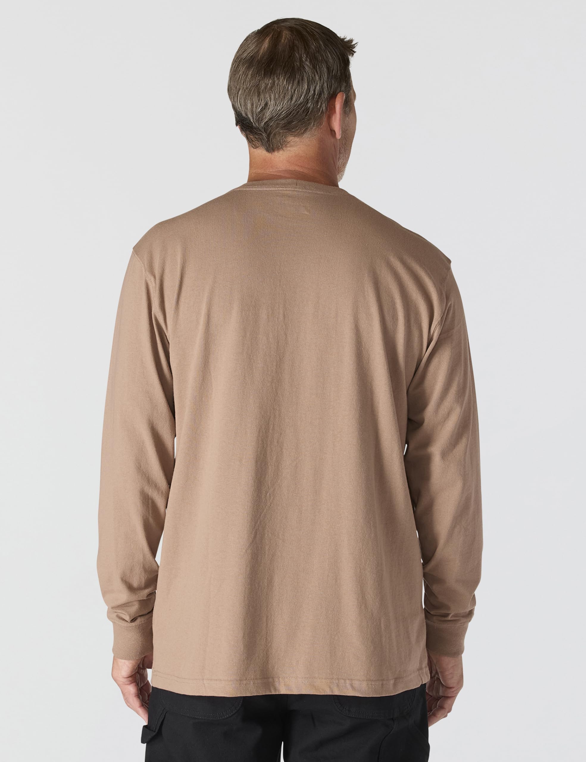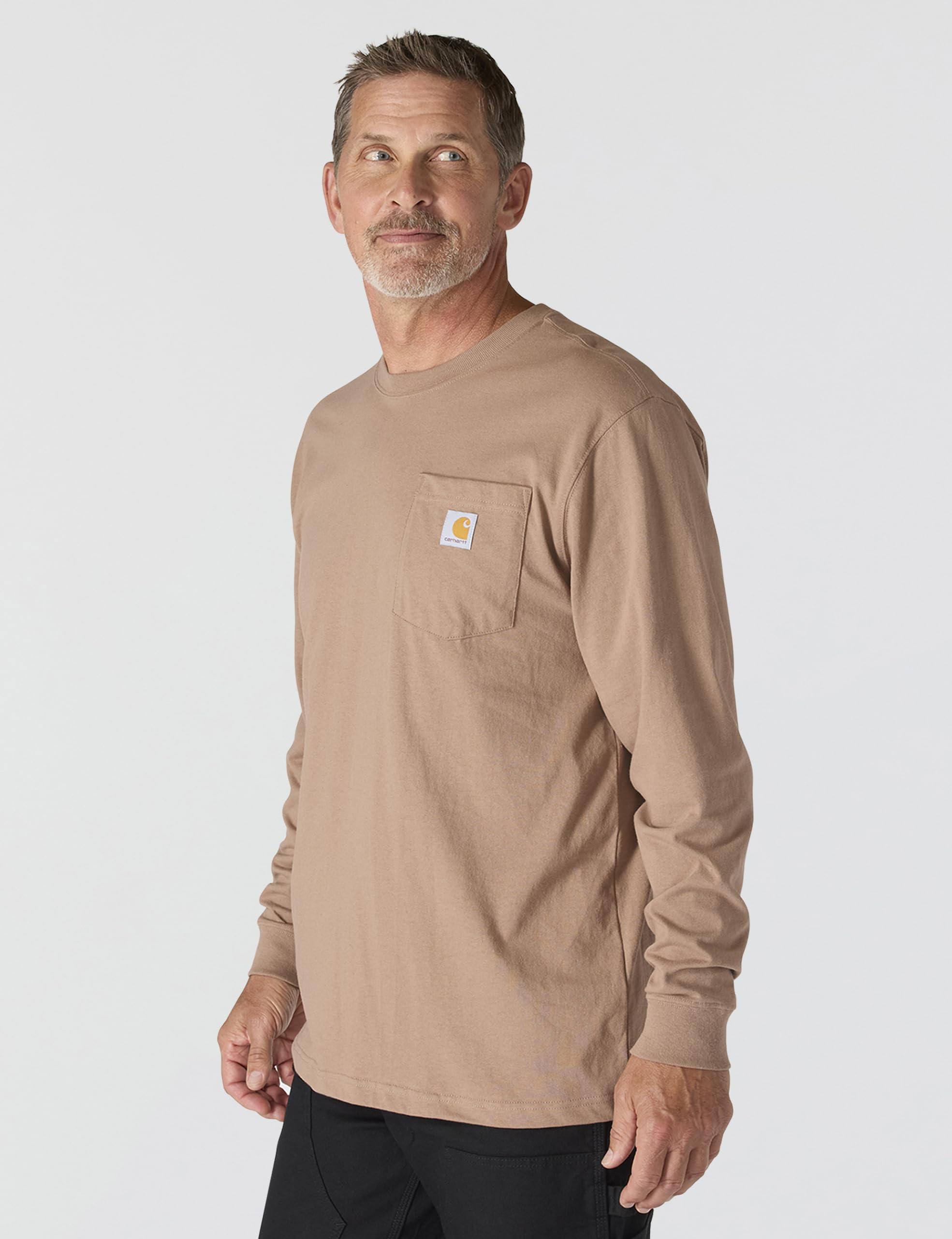 Description Product Description Heavyweight, durable and casual. Holds up when you put it through the ringer day after day. From the Manufacturer Made of 6.75-ounce, 100% cotton jersey our long sleeve pocket t-shirt makes for perfect workwear layered or worn alone. It features a crew neck with a generous left chest pocket and side-seamed construction to minimize twisting. Ash fiber content is 99%/1% polyester. Heather gray fiber content is 90% cotton/10% polyester.