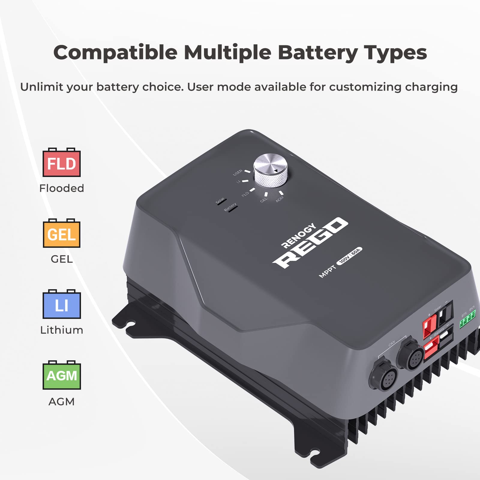 Revolutionize off-grid systems with powerful IoT and Plug and Play. The REGO 12V 60A MPPT Solar Charge Controller features by easy-to-connect Anderson terminal, ultra safety, RV-C capability, and MPPT technology. Built-in BPU (battery protect unit) offers extraordinary protection for your batteries. RV-C communication enables integrated management of the power system. Light and compact design, smart and reliable functions. The REGO system redefines the standard for smart energy solutions in the RV and mobile lifestyle market. Consolidating the latest technologies in battery monitoring, energy storage, and ease of installation and maintenance, REGO is a simple plug and play smart energy system that allows customers to enjoy their time spent off-grid with connected smart energy system.