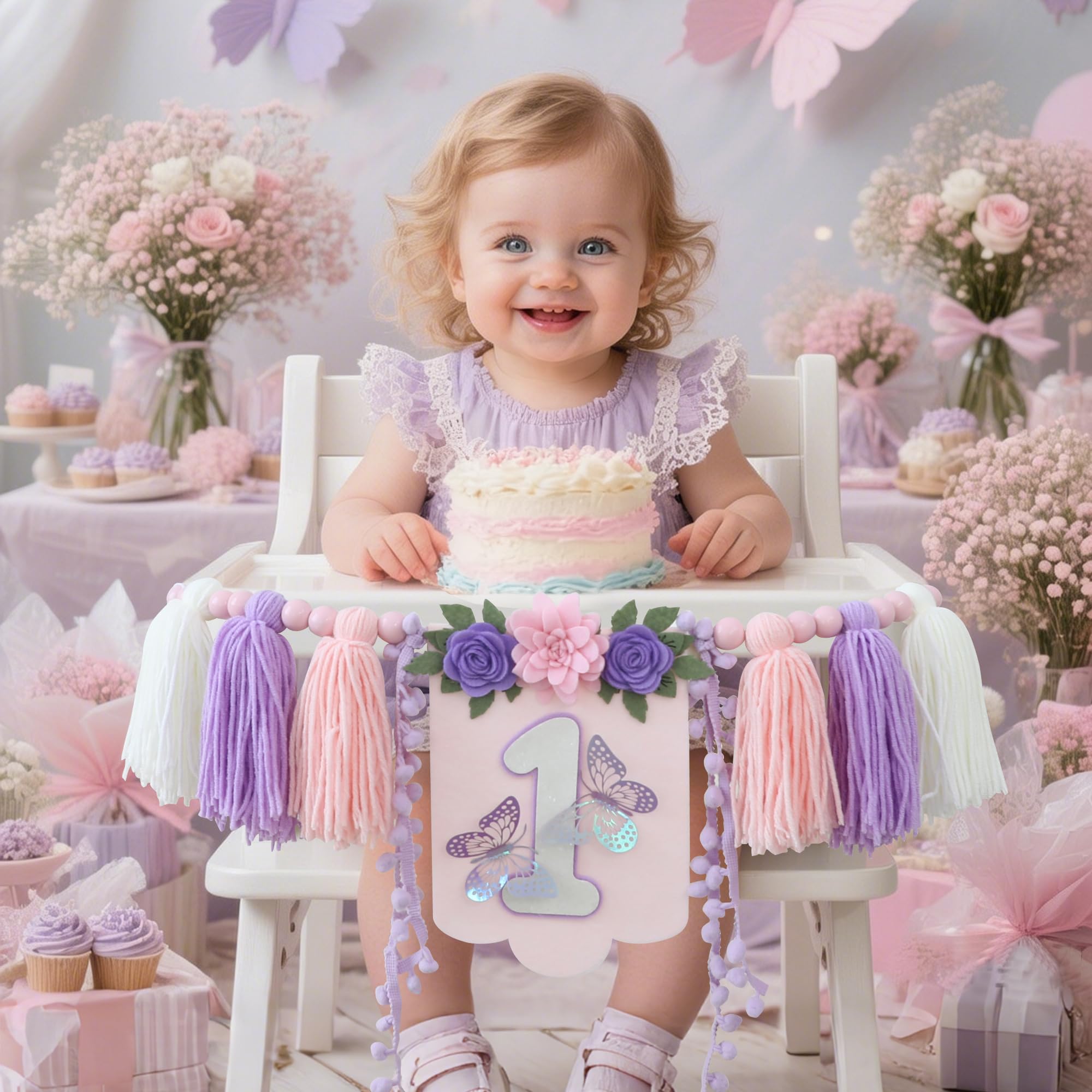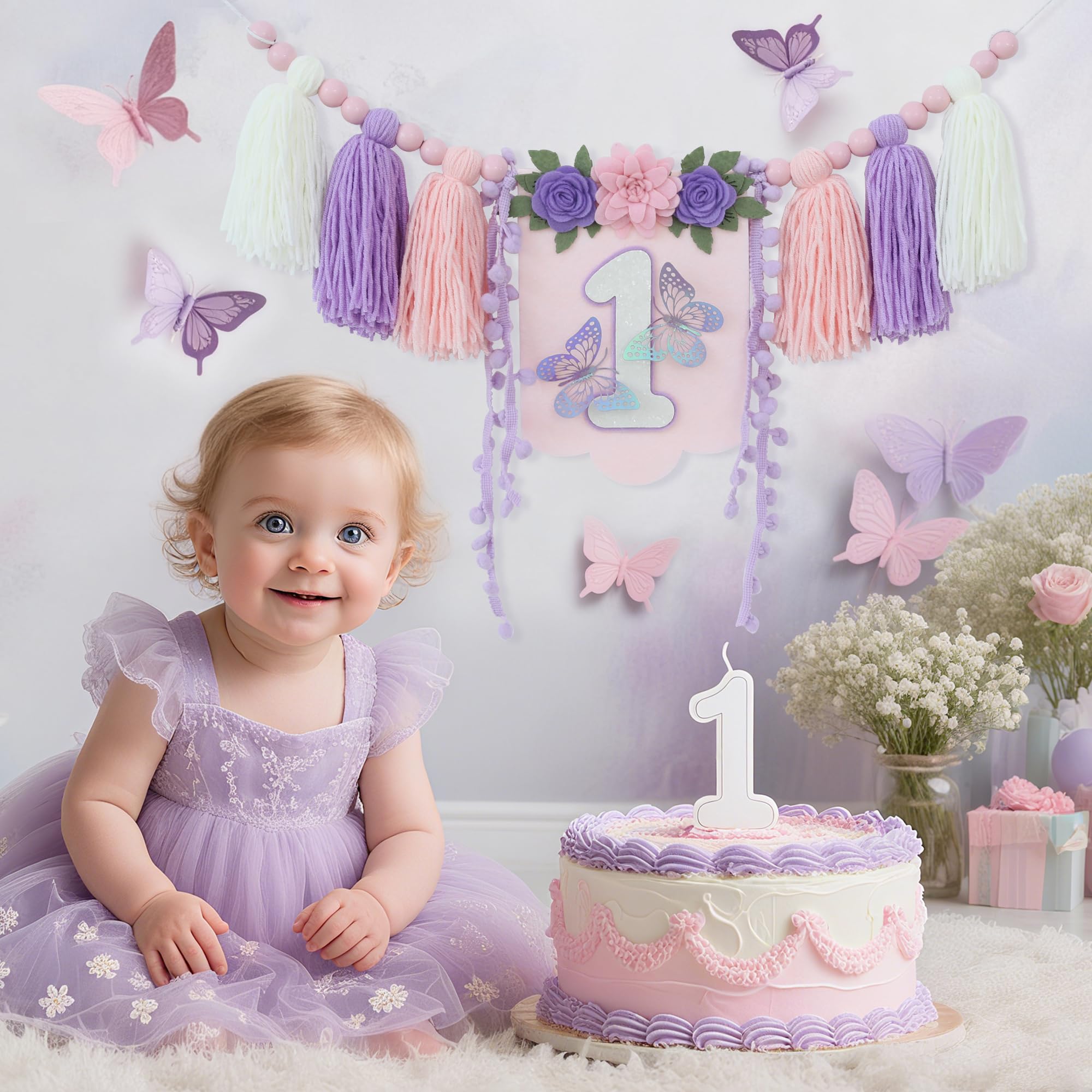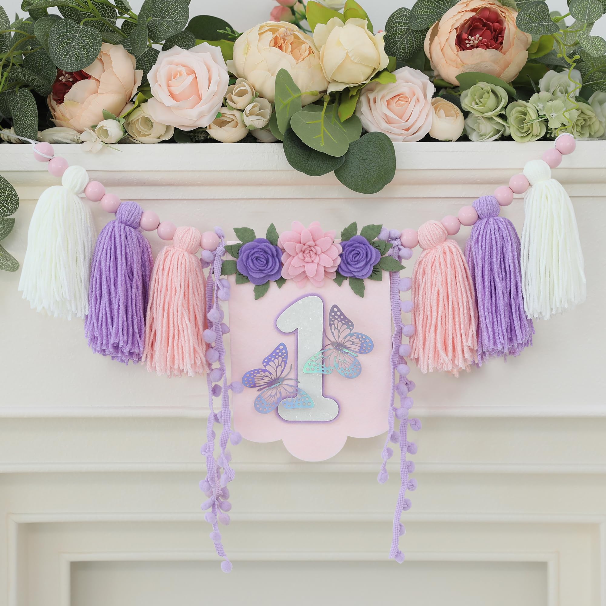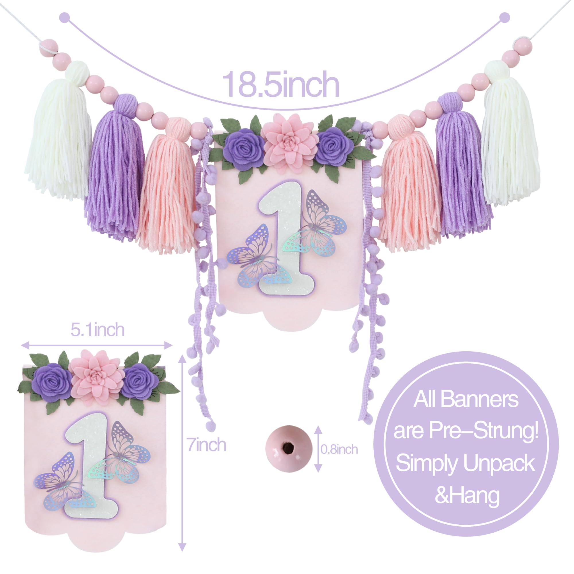 Package Content: a high chair banner with white, purple and pink wool tassels and pink beads; banner with butterflies, flowers and the number 1 style