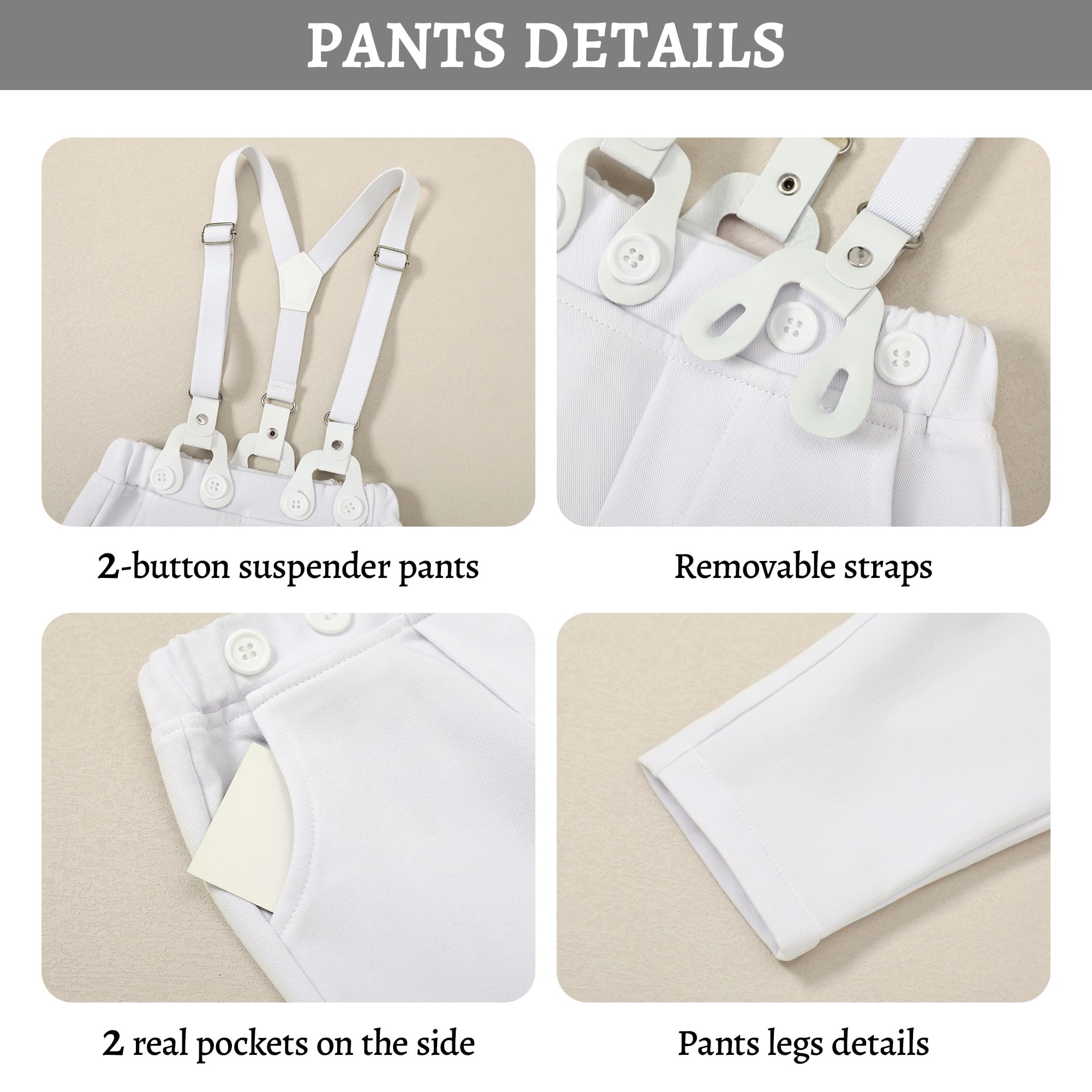 STYLISH SET: The 6-piece baby boy clothes set includes 1x shirt, 1x removable bow tie, 1x vest, 1x corsage, 1x pants and 1x suspenders. The shirt comes with a removable bow tie, convenient for different occasions. With a single-breasted vest, a corsage and elegant pants, it is suitable for formal occasions such as weddings and christenings, as well as for daily wear. The whole set of clothing is simple but not lose fashion, making the baby more gentlemanly.