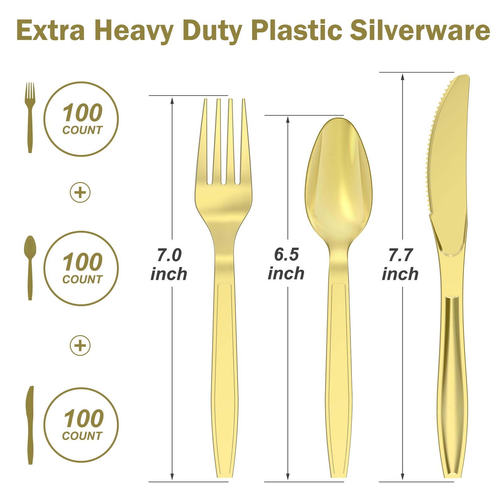 Dealusy 300 Count Extra Heavy Duty Gold Plastic Silverware, 100 Forks, 100 Spoons, 100 Knives, BPA-Free, Heat Resistant, Disposable Plastic Utensils Set, Plastic Cutlery Set, Plasticware Bulk