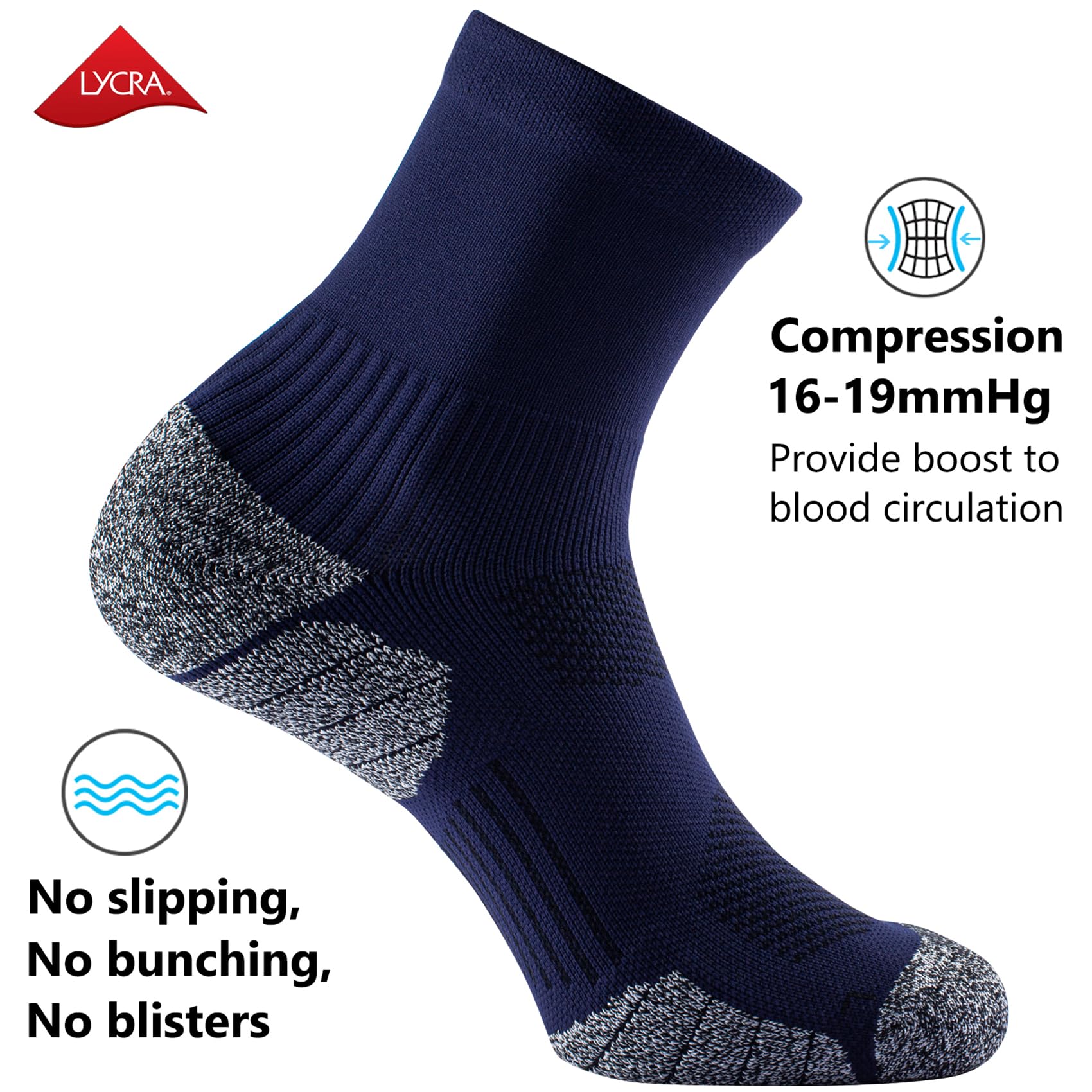 COMPRESSION FIT: Sport socks with targeted compression (16-19 mmHg) to provide boost to your blood circulation, anti-swelling, arch support, fit your feet perfectly and no slipping, no bunching, no blisters